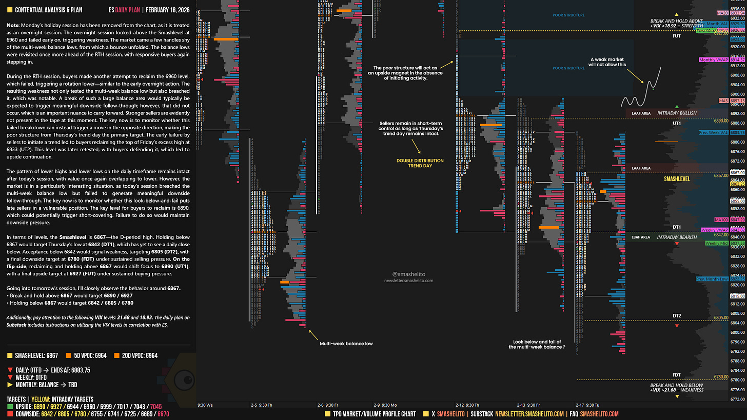 Note: Monday’s holiday session has been removed from the chart, as it is treated as an overnight session. The overnight session looked above the Smashlevel at 6960 and failed early on, triggering weakness. The market came a few handles shy of the multi-week balance lows, from which a bounce unfolded. The balance lows were revisited once more ahead of the RTH session, with responsive buyers again stepping in.