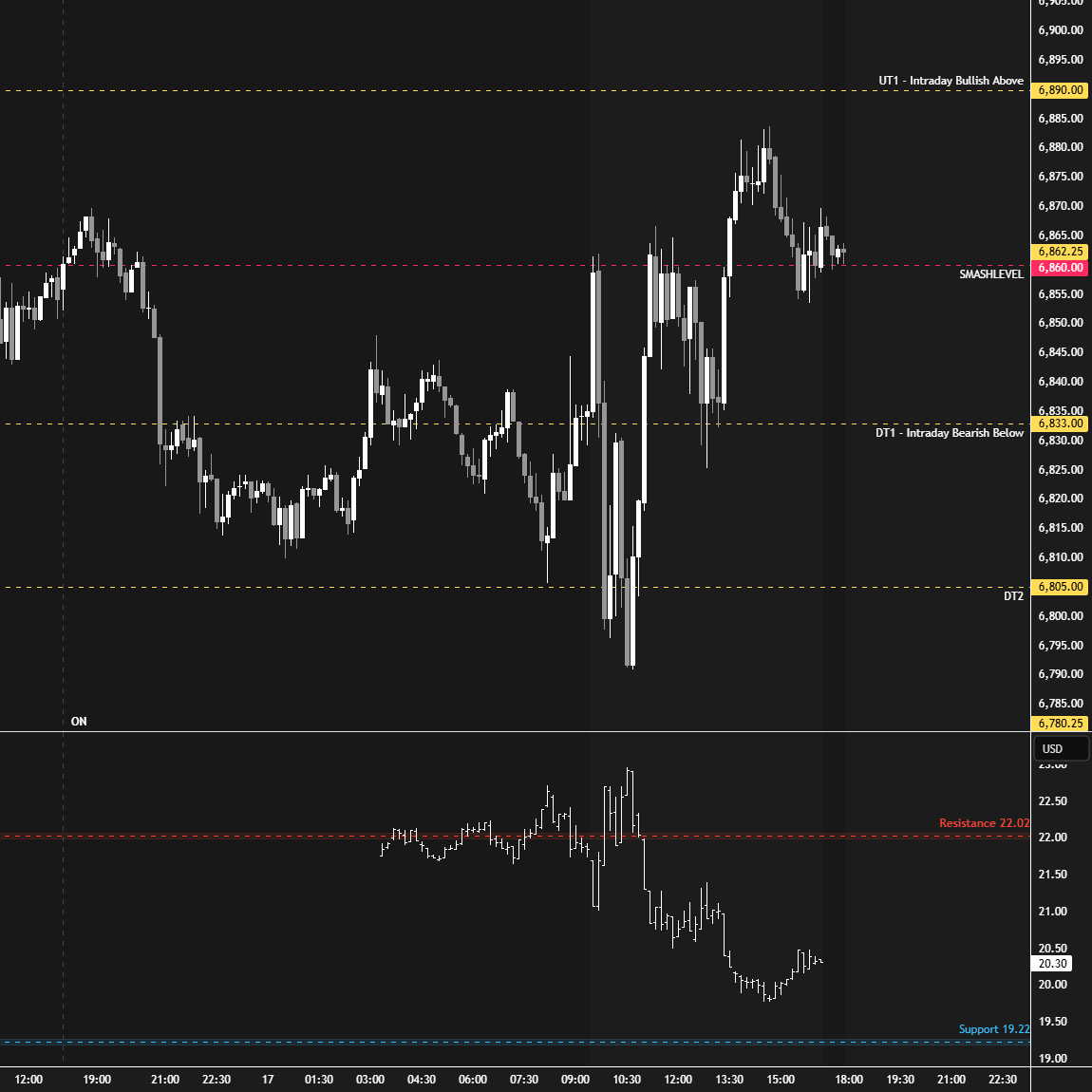 In terms of levels, the Smashlevel is 6867—the D-period high. Holding below 6867 would target Thursday’s low at 6842 (DT1), which has yet to see a daily close below. Acceptance below 6842 would signal weakness, targeting 6805 (DT2), with a final downside target at 6780 (FDT) under sustained selling pressure.