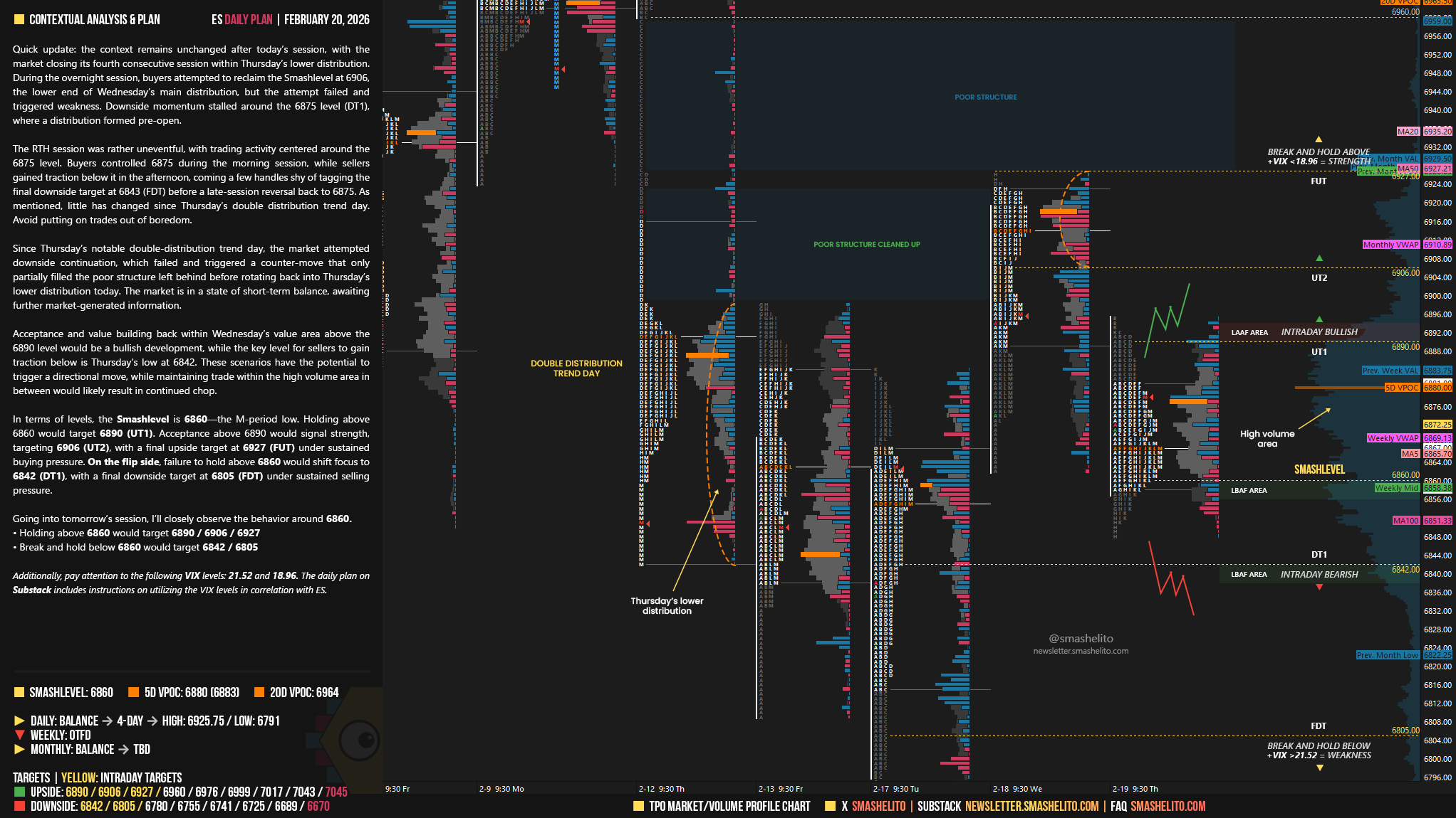 Quick update: the context remains unchanged after today’s session, with the market closing its fourth consecutive session within Thursday’s lower distribution. During the overnight session, buyers attempted to reclaim the Smashlevel at 6906, the lower end of Wednesday’s main distribution, but the attempt failed and triggered weakness. Downside momentum stalled around the 6875 level (DT1), where a distribution formed pre-open.
