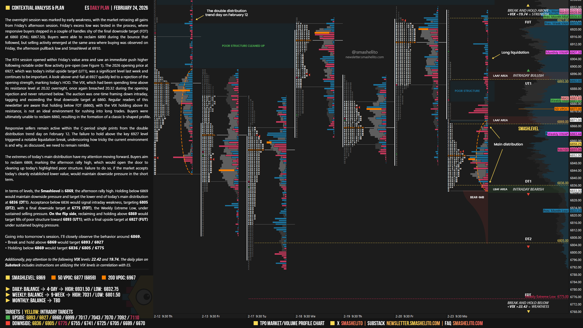 Responsive sellers remain active within the C-period single prints from the double distribution trend day on February 12. The failure to hold above the key 6927 level triggered a notable liquidation break, underscoring how tricky the current environment is and why, as discussed, we need to remain nimble.