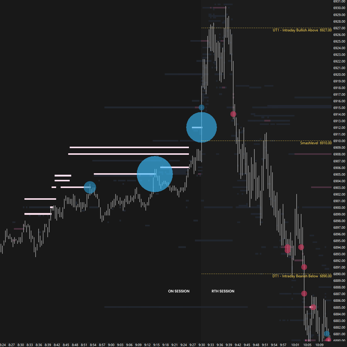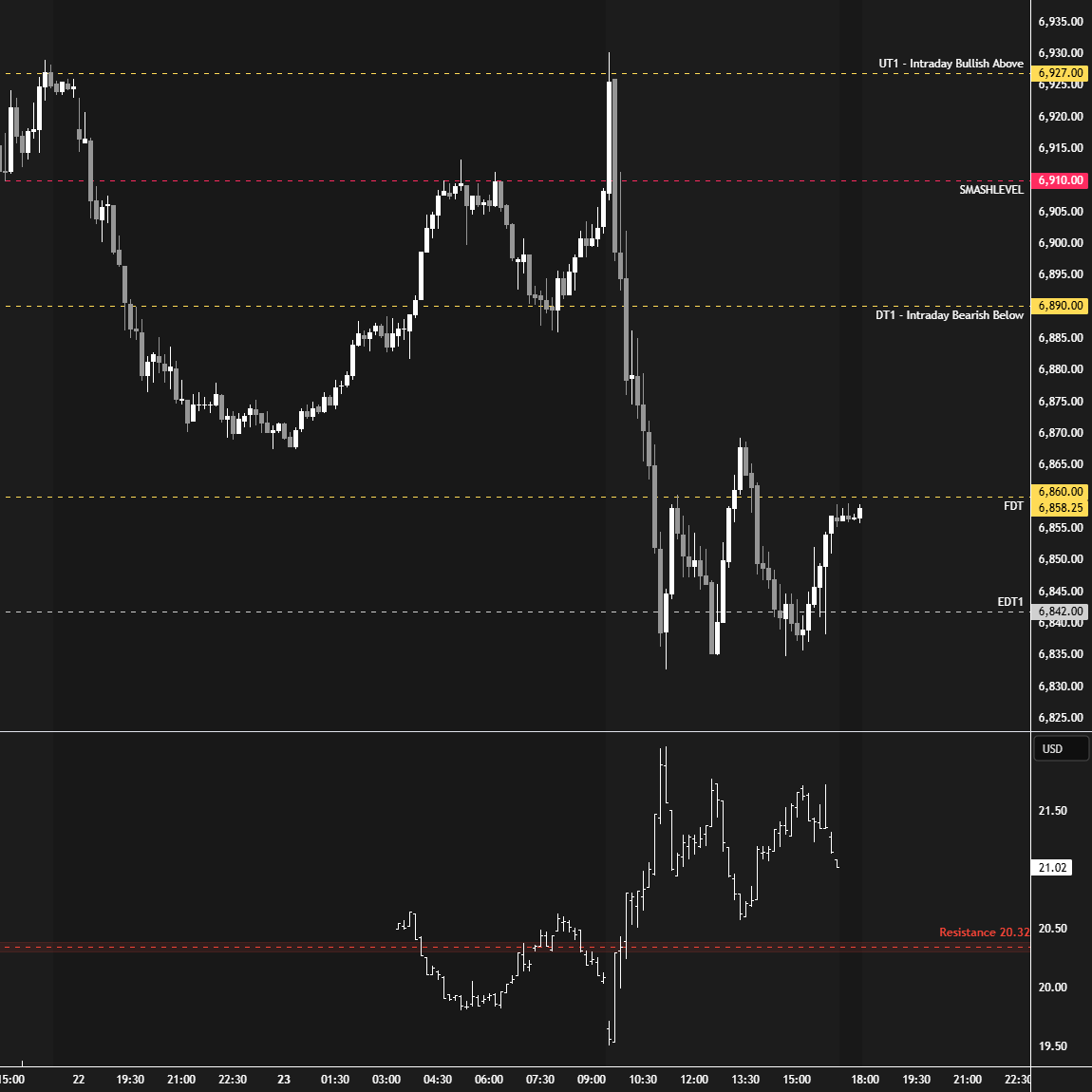 In terms of levels, the Smashlevel is 6869, the afternoon rally high. Holding below 6869 would maintain downside pressure and target the lower end of today’s main distribution at 6836 (DT1). Acceptance below 6836 would signal intraday weakness, targeting 6805 (DT2), with a final downside target at 6775 (FDT), the Weekly Extreme Low, under sustained selling pressure.