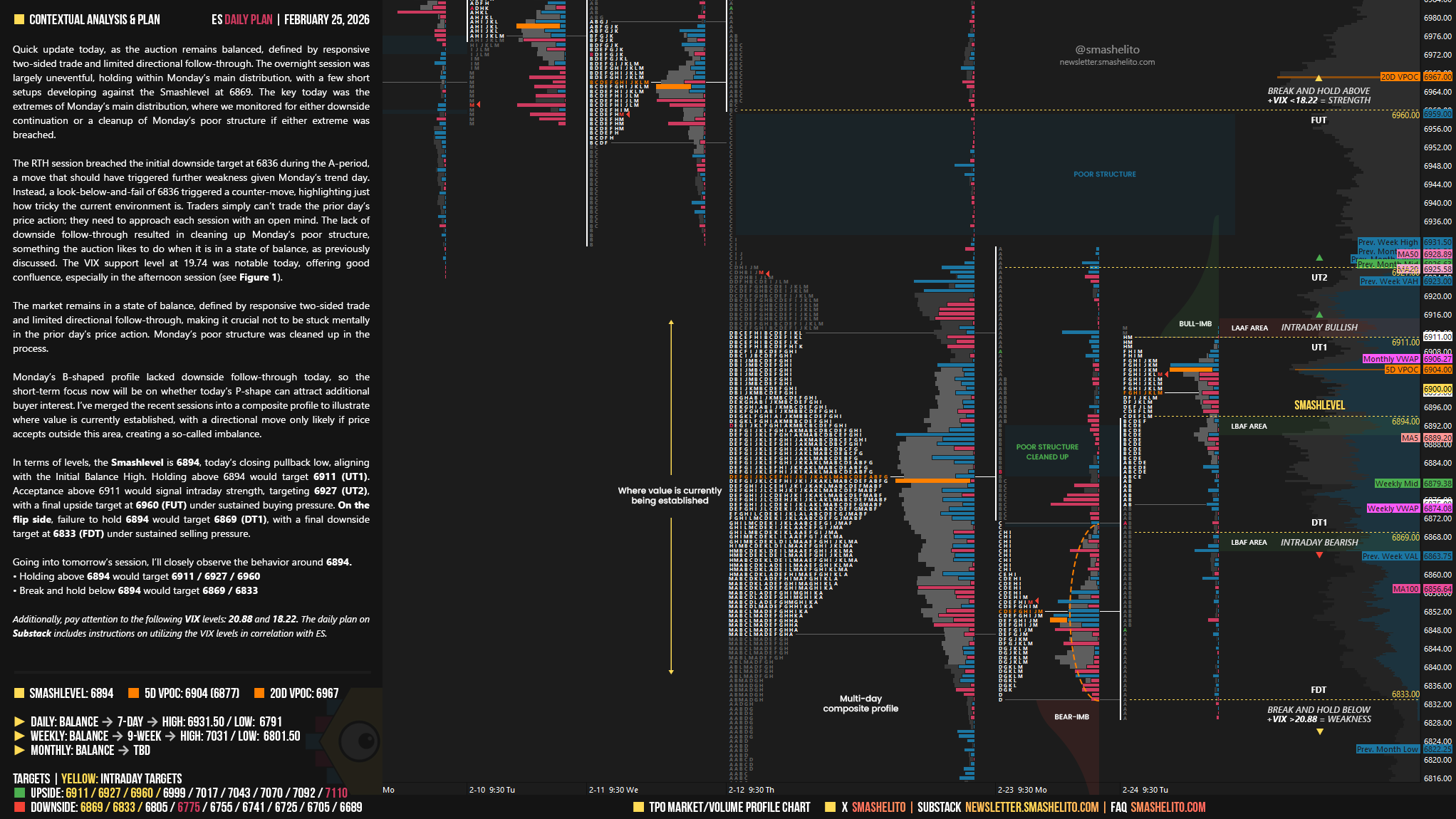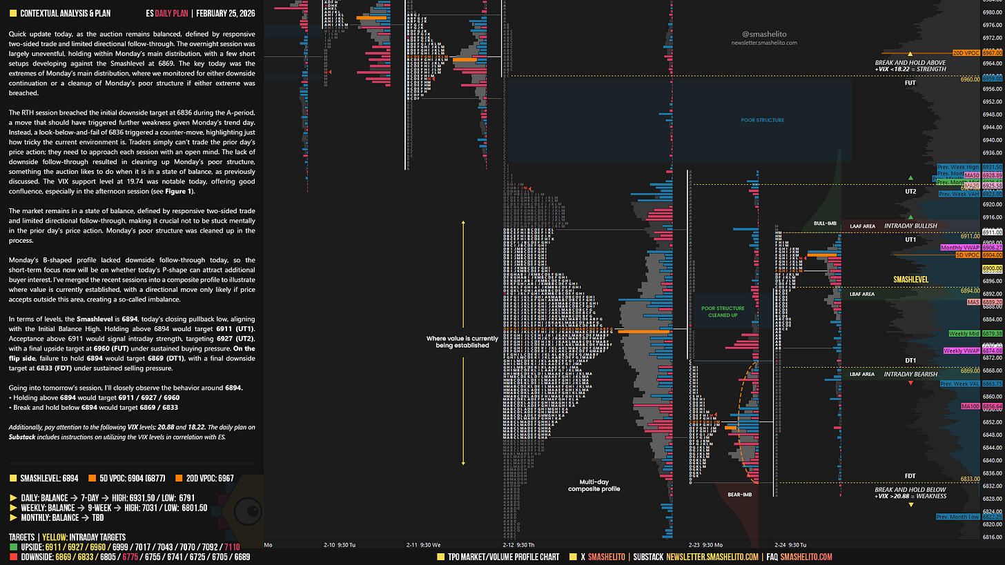 Quick update today, as the auction remains balanced, defined by responsive two-sided trade and limited directional follow-through. The overnight session was largely uneventful, holding within Monday’s main distribution, with a few short setups developing against the Smashlevel at 6869. The key today was the extremes of Monday’s main distribution, where we monitored for either downside continuation or a cleanup of Monday’s poor structure if either extreme was breached.
