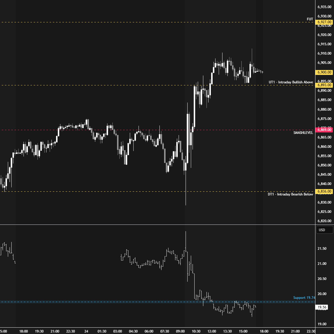 In terms of levels, the Smashlevel is 6894, today’s closing pullback low, aligning with the Initial Balance High. Holding above 6894 would target 6911 (UT1). Acceptance above 6911 would signal intraday strength, targeting 6927 (UT2), with a final upside target at 6960 (FUT) under sustained buying pressure.