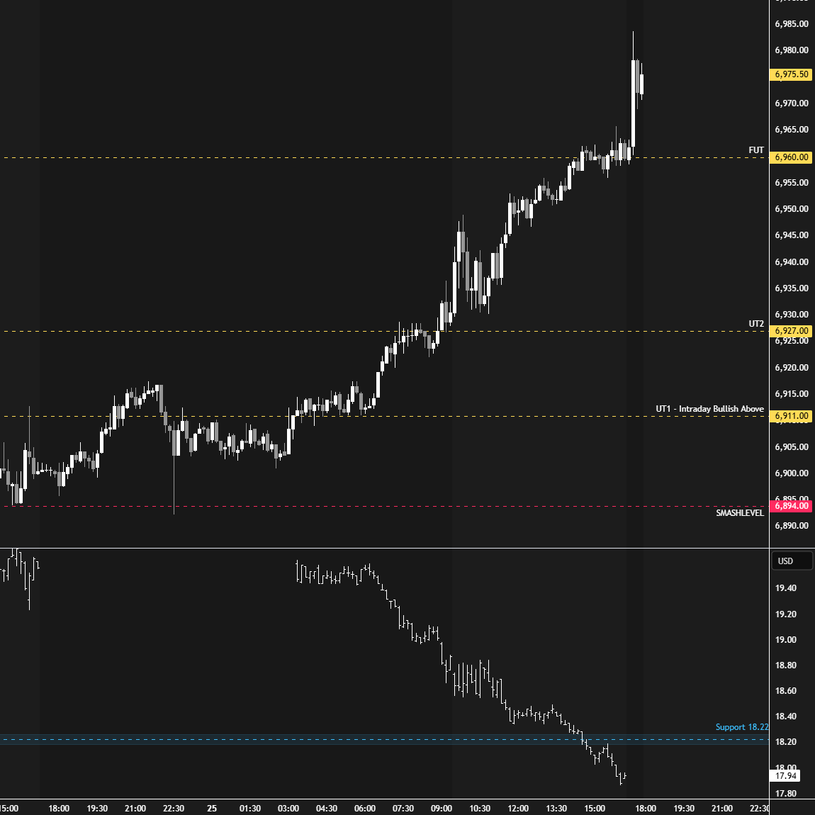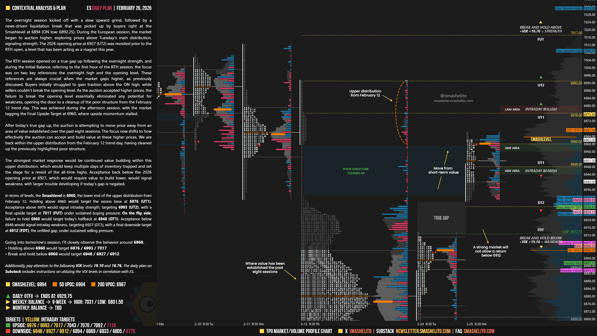 In terms of levels, the Smashlevel is 6960, the lower end of the upper distribution from February 12. Holding above 6960 would target the excess base at 6976 (UT1). Acceptance above 6976 would signal intraday strength, targeting 6993 (UT2), with a final upside target at 7017 (FUT) under sustained buying pressure.