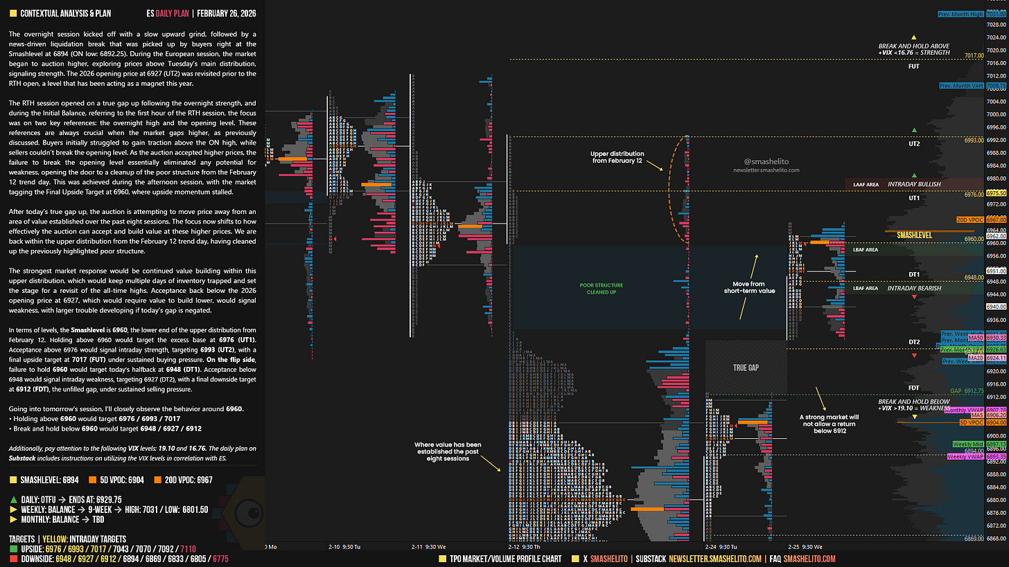 The overnight session kicked off with a slow upward grind, followed by a news-driven liquidation break that was picked up by buyers right at the Smashlevel at 6894 (ON low: 6892.25). During the European session, the market began to auction higher, exploring prices above Tuesday’s main distribution, signaling strength. The 2026 opening price at 6927 (UT2) was revisited prior to the RTH open, a level that has been acting as a magnet this year.