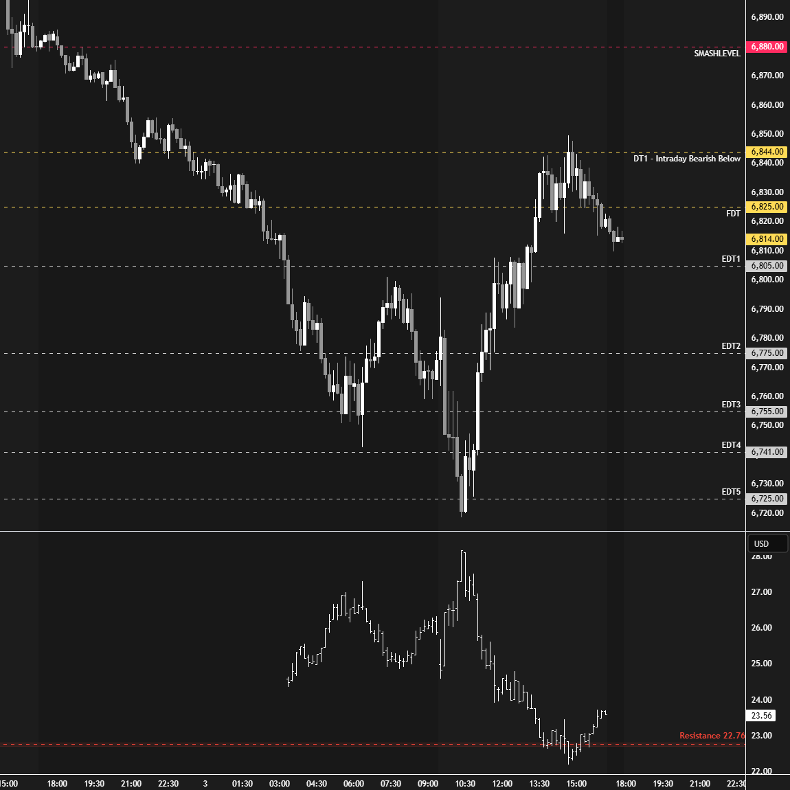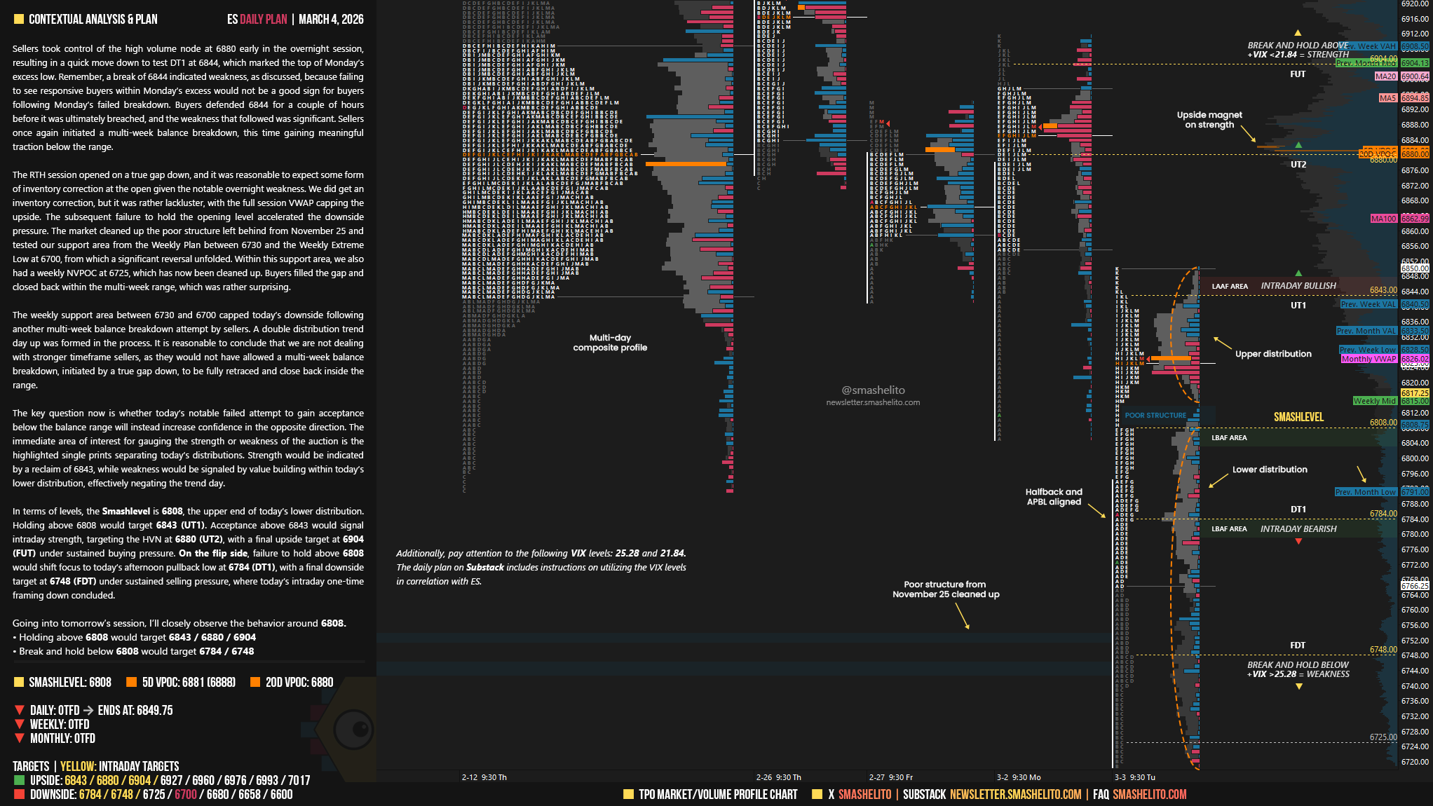 In terms of levels, the Smashlevel is 6808, the upper end of today’s lower distribution. Holding above 6808 would target 6843 (UT1). Acceptance above 6843 would signal intraday strength, targeting the HVN at 6880 (UT2), with a final upside target at 6904 (FUT) under sustained buying pressure.