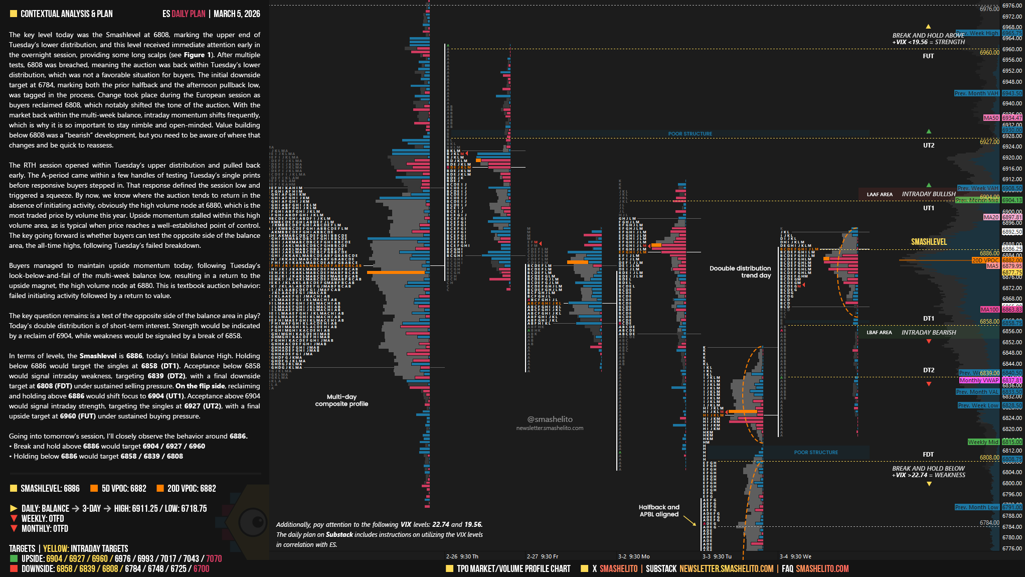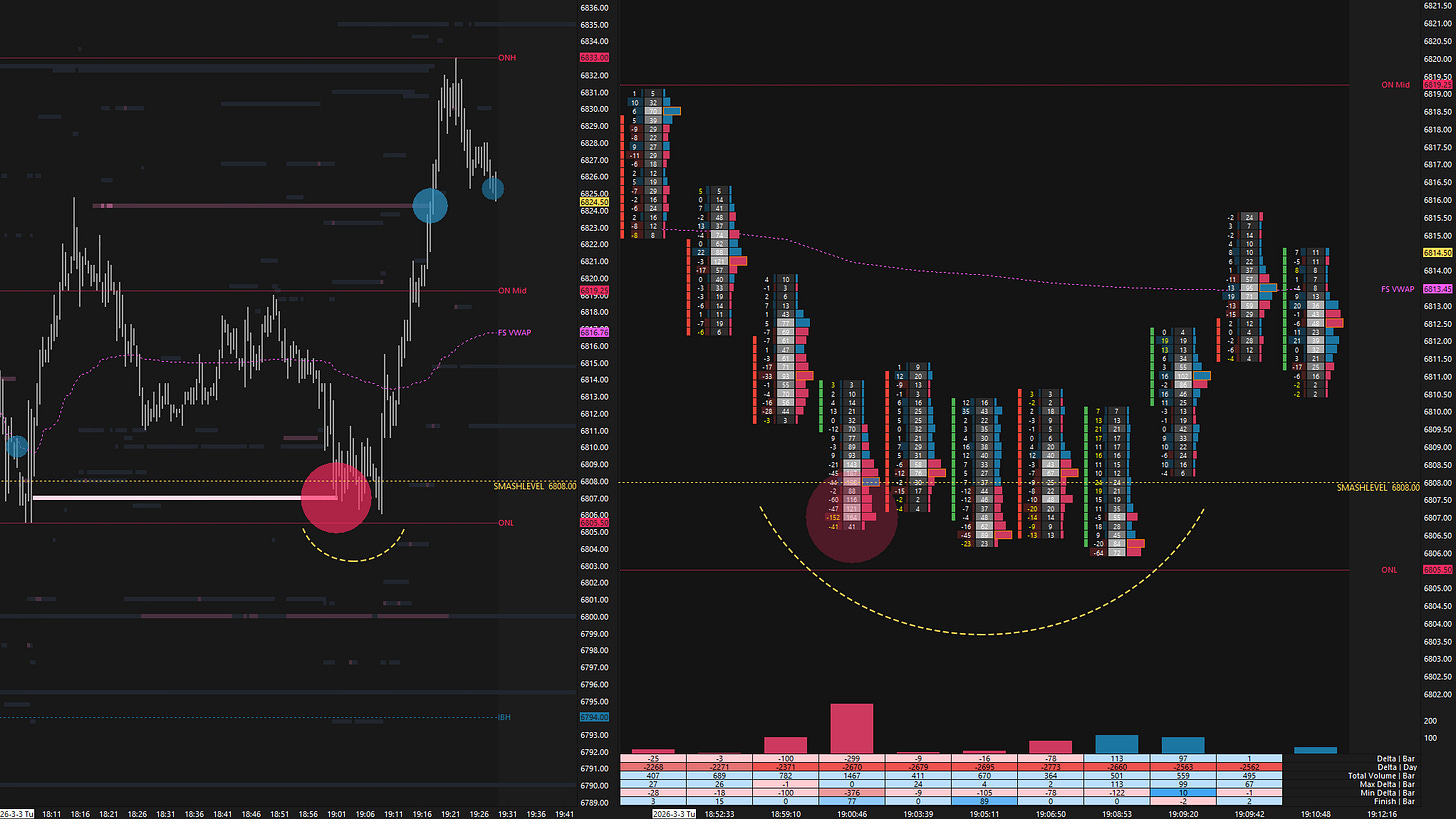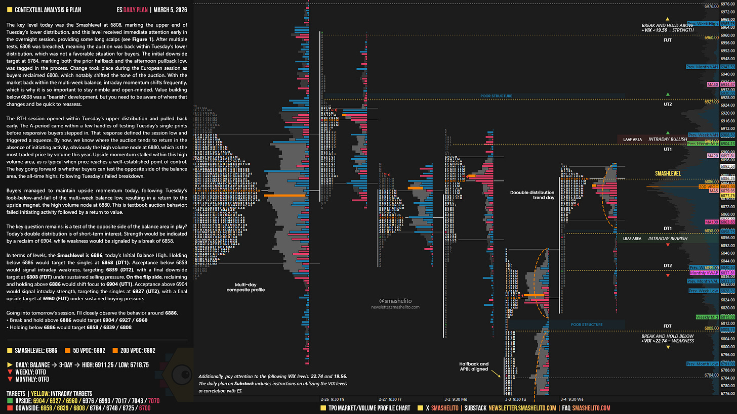 In terms of levels, the Smashlevel is 6886, today’s Initial Balance High. Holding below 6886 would target the singles at 6858 (DT1). Acceptance below 6858 would signal intraday weakness, targeting 6839 (DT2), with a final downside target at 6808 (FDT) under sustained selling pressure.