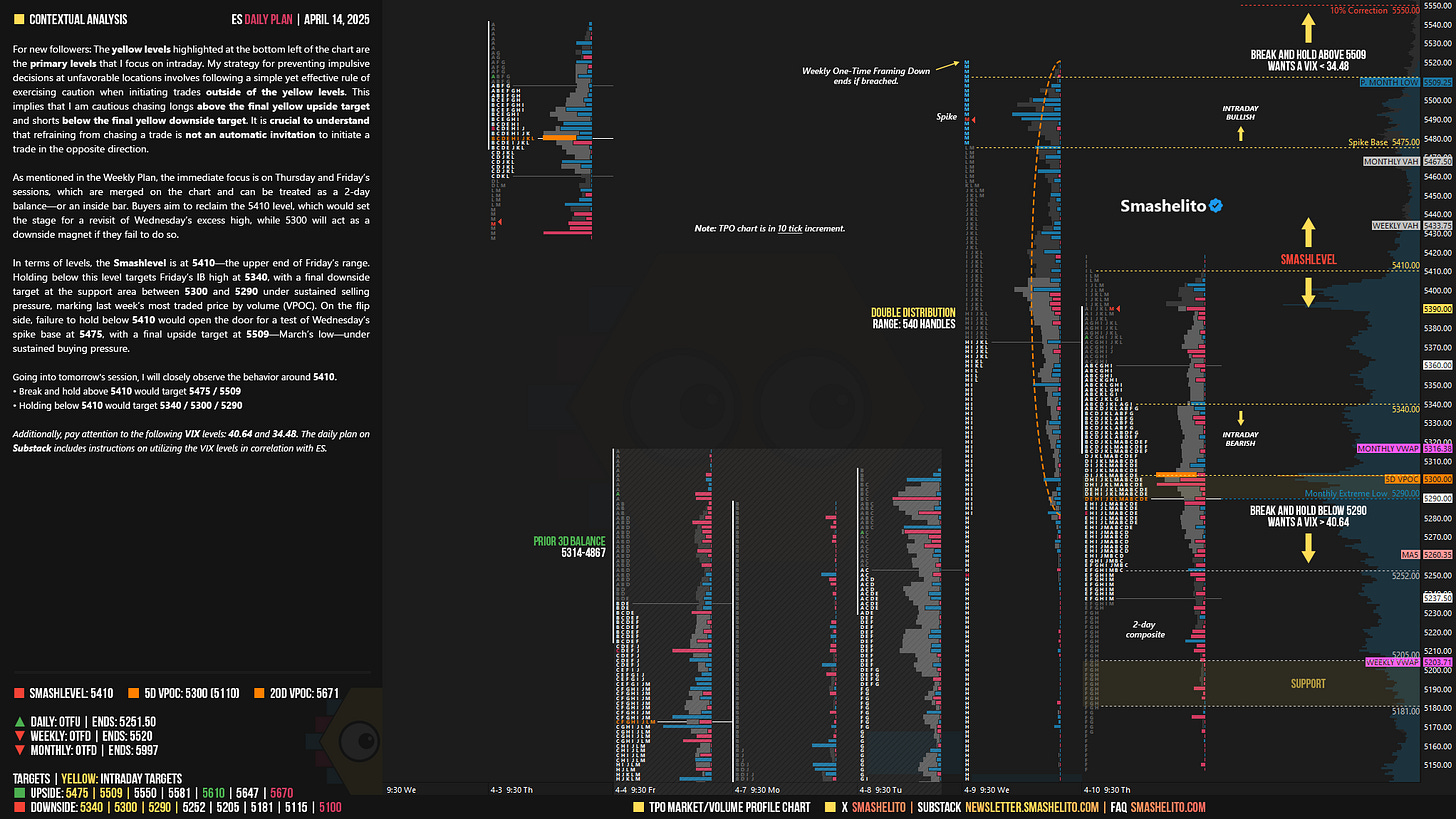 In terms of levels, the Smashlevel is at 5410—the upper end of Friday’s range. Holding below this level targets Friday’s IB high at 5340, with a final downside target at the support area between 5300 and 5290 under sustained selling pressure, marking last week’s most traded price by volume (VPOC). On the flip side, failure to hold below 5410 would open the door for a test of Wednesday’s spike base at 5475, with a final upside target at 5509—March’s low—under sustained buying pressure.
