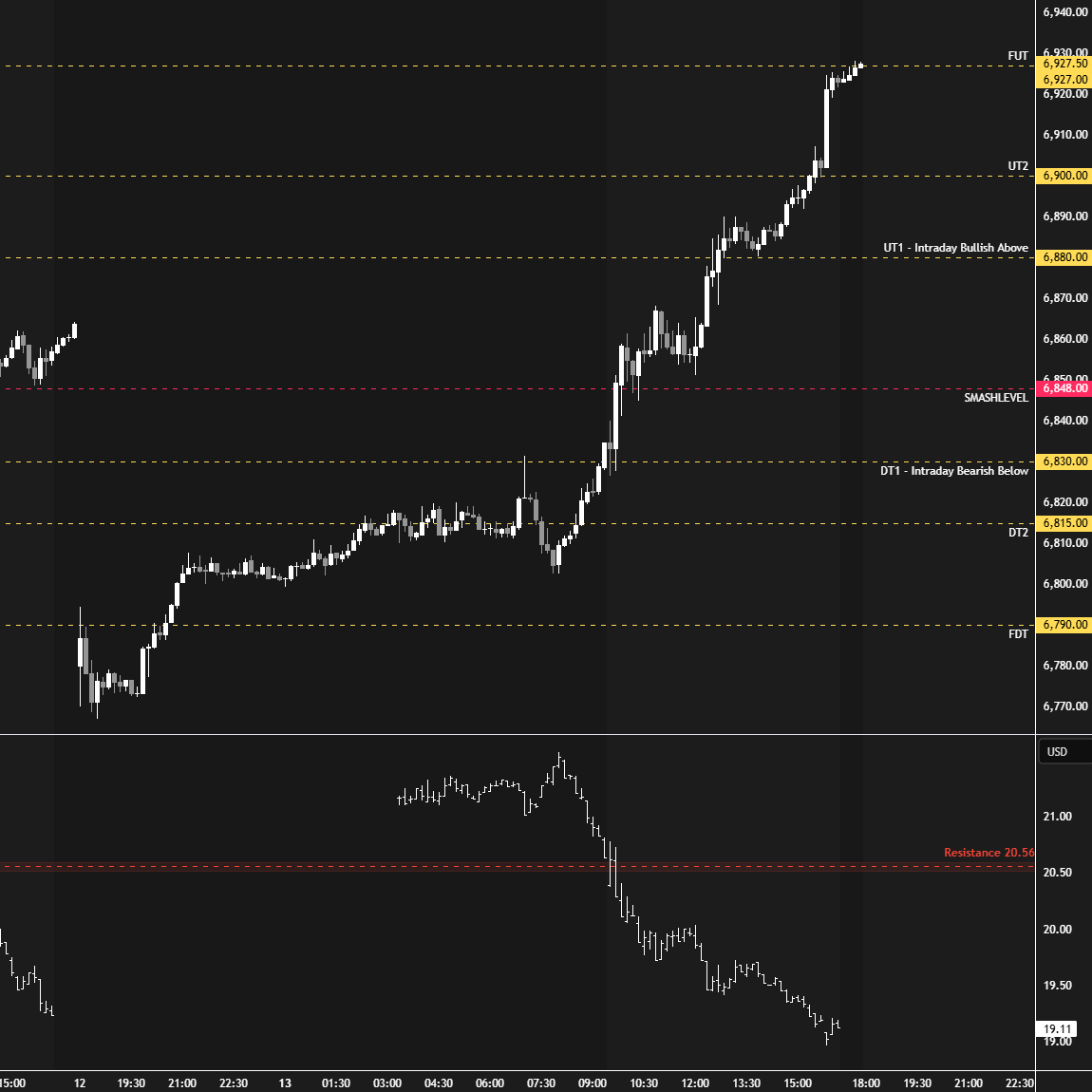 In terms of levels, the Smashlevel is 6900, the spike base. Holding above 6900 signals stability and targets the 2026 opening price at 6927 (UT1). Acceptance above 6927 would signal intraday strength, targeting 6960 (UT2), with a final upside target at 6981 (FUT) under sustained buying pressure.