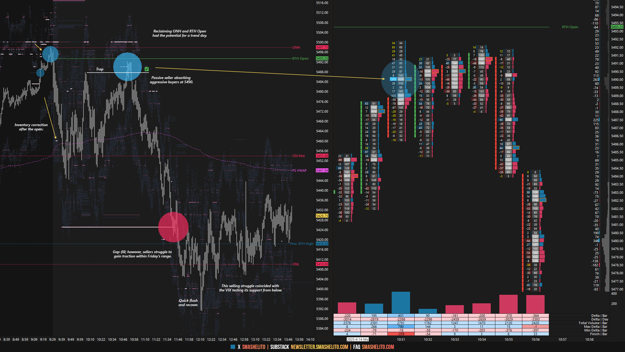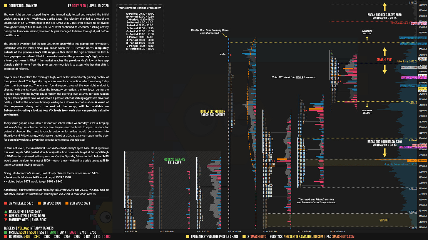 In terms of levels, the Smashlevel is at 5475—Wednesday’s spike base. Holding below this level targets 5406 (tested after-hours) with a final downside target at Friday’s IB high of 5340 under sustained selling pressure. On the flip side, failure to hold below 5475 would open the door for a test of 5509—March’s low—with a final upside target at 5550 under sustained buying pressure.