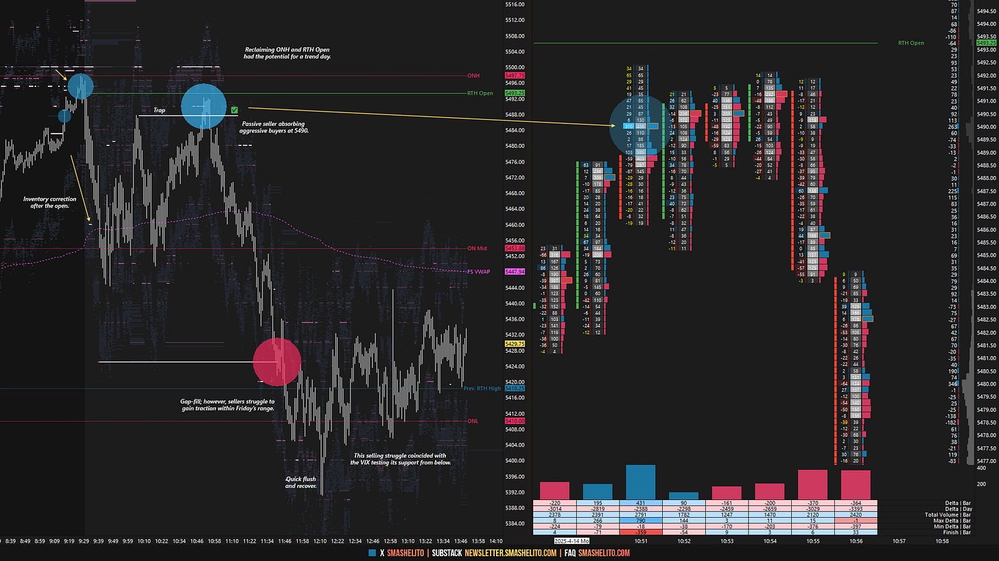 Notably, the VIX held below its support level of 34.48 for nearly the entire session. An interesting aspect of the battle around 5410 was that the VIX retested its support from below, providing valuable confluence. In situations where the VIX holds below support and ES still has distance to its final upside target, I typically exercise caution with shorting due to the potential for continued strength, and I expect buyers to be active on dips. The market started grinding higher as the VIX held below support—indicating that sellers couldn’t gain acceptance within Friday’s range and suggesting caution with pressing potential shorts. The afternoon session revisited the 5475 level, which attracted sellers into the close.