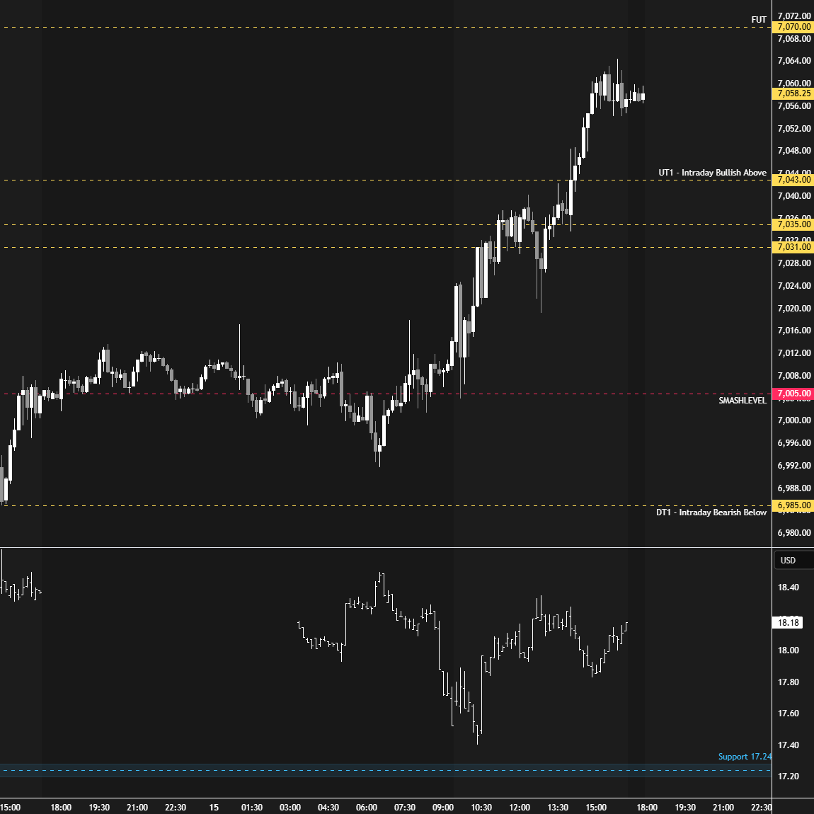 In terms of levels, the Smashlevel is 7062, the Monthly Extreme High. Holding below 7062 would target technical fills of structure toward 7043-35 (DT1), with a final downside target at 7005 (FDT) under sustained selling pressure.