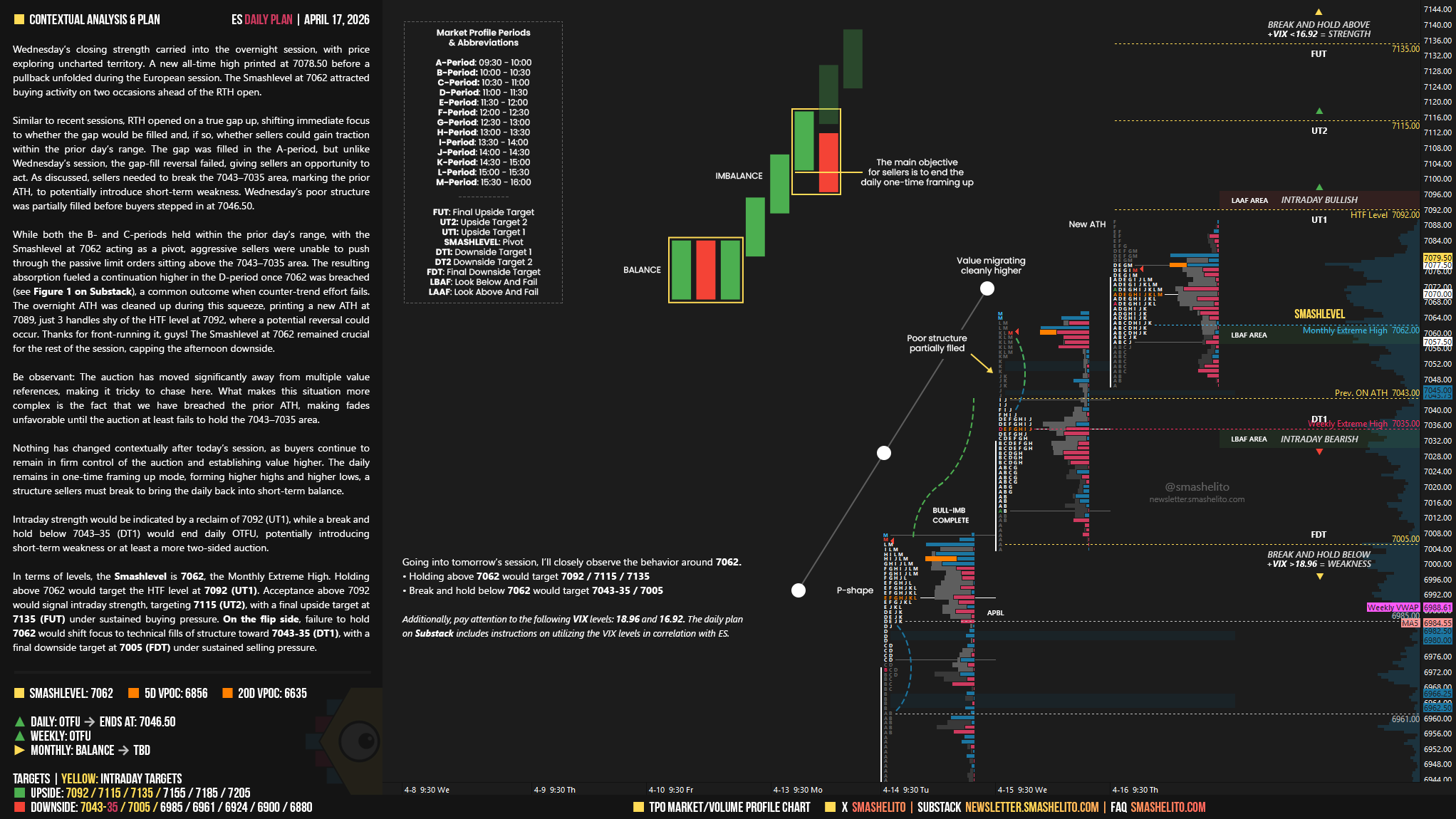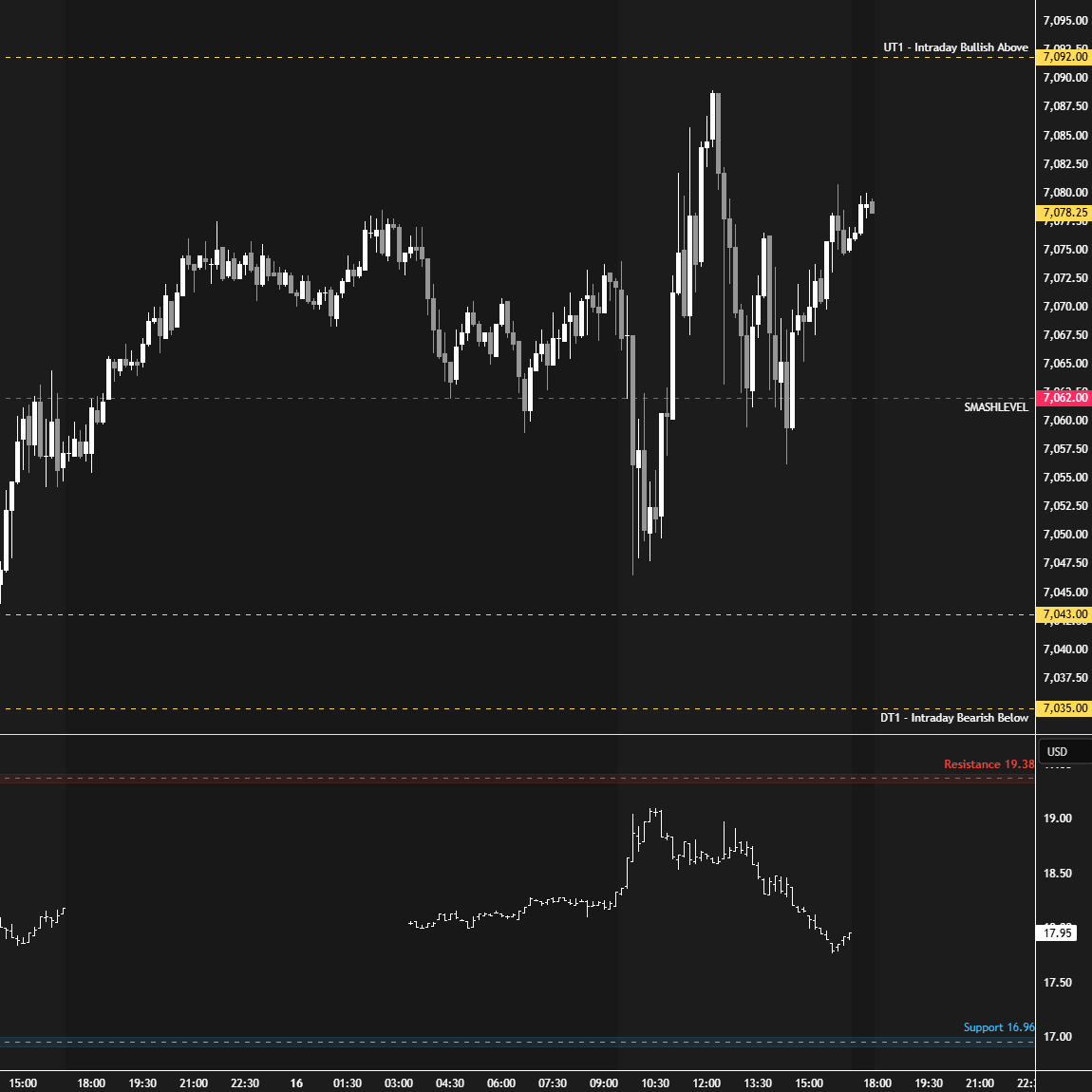 In terms of levels, the Smashlevel is 7062, the Monthly Extreme High. Holding above 7062 would target the HTF level at 7092 (UT1). Acceptance above 7092 would signal intraday strength, targeting 7115 (UT2), with a final upside target at 7135 (FUT) under sustained buying pressure.