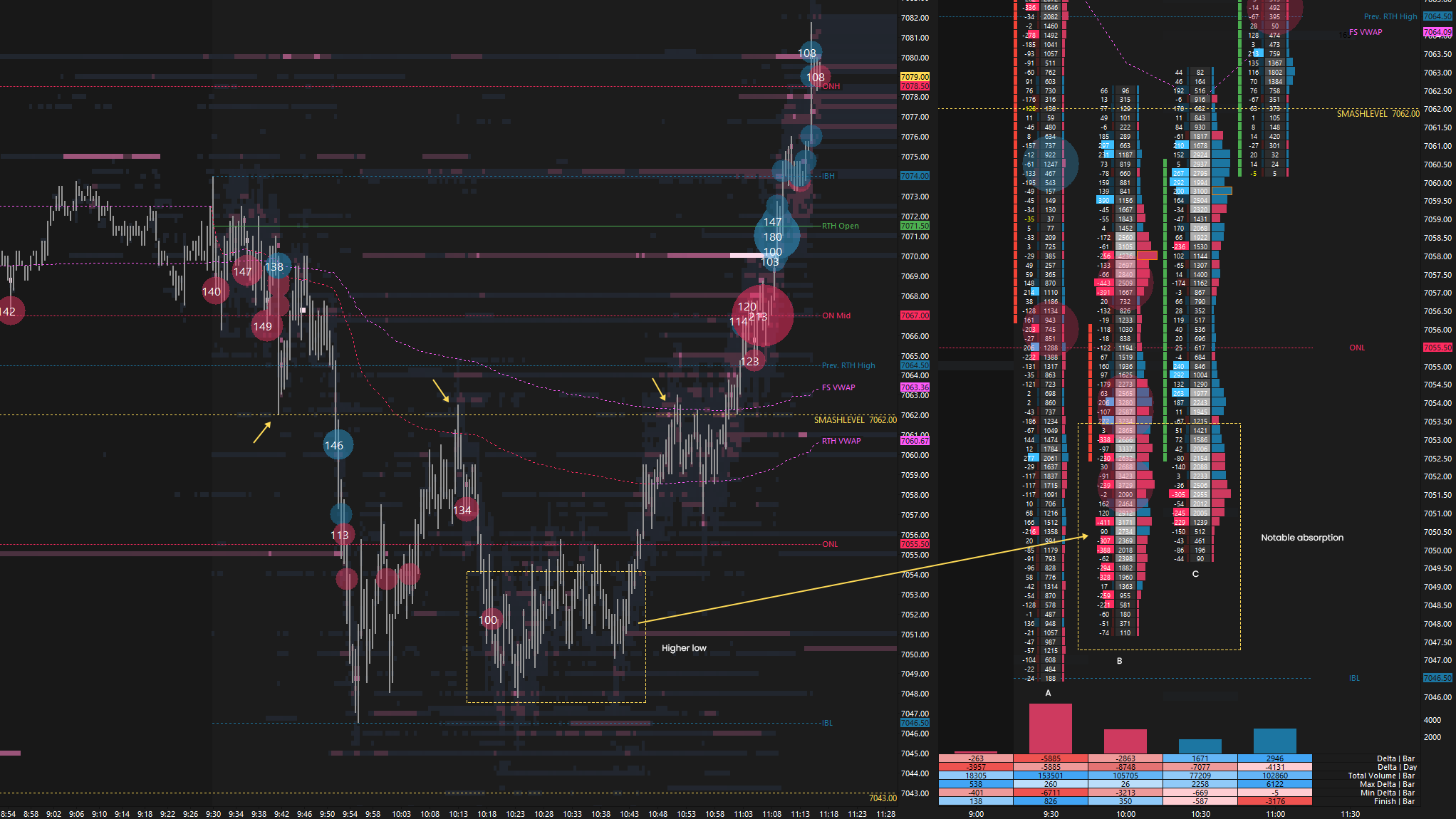 While both the B- and C-periods held within the prior day’s range, with the Smashlevel at 7062 acting as a pivot, aggressive sellers were unable to push through the passive limit orders sitting above the 7043–7035 area. The resulting absorption fueled a continuation higher in the D-period once 7062 was breached (see Figure 1), a common outcome when counter-trend effort fails. The overnight ATH was cleaned up during this squeeze, printing a new ATH at 7089, just 3 handles shy of the HTF level at 7092, where a potential reversal could occur. Thanks for front-running it, guys! The Smashlevel at 7062 remained crucial for the rest of the session, capping the afternoon downside.