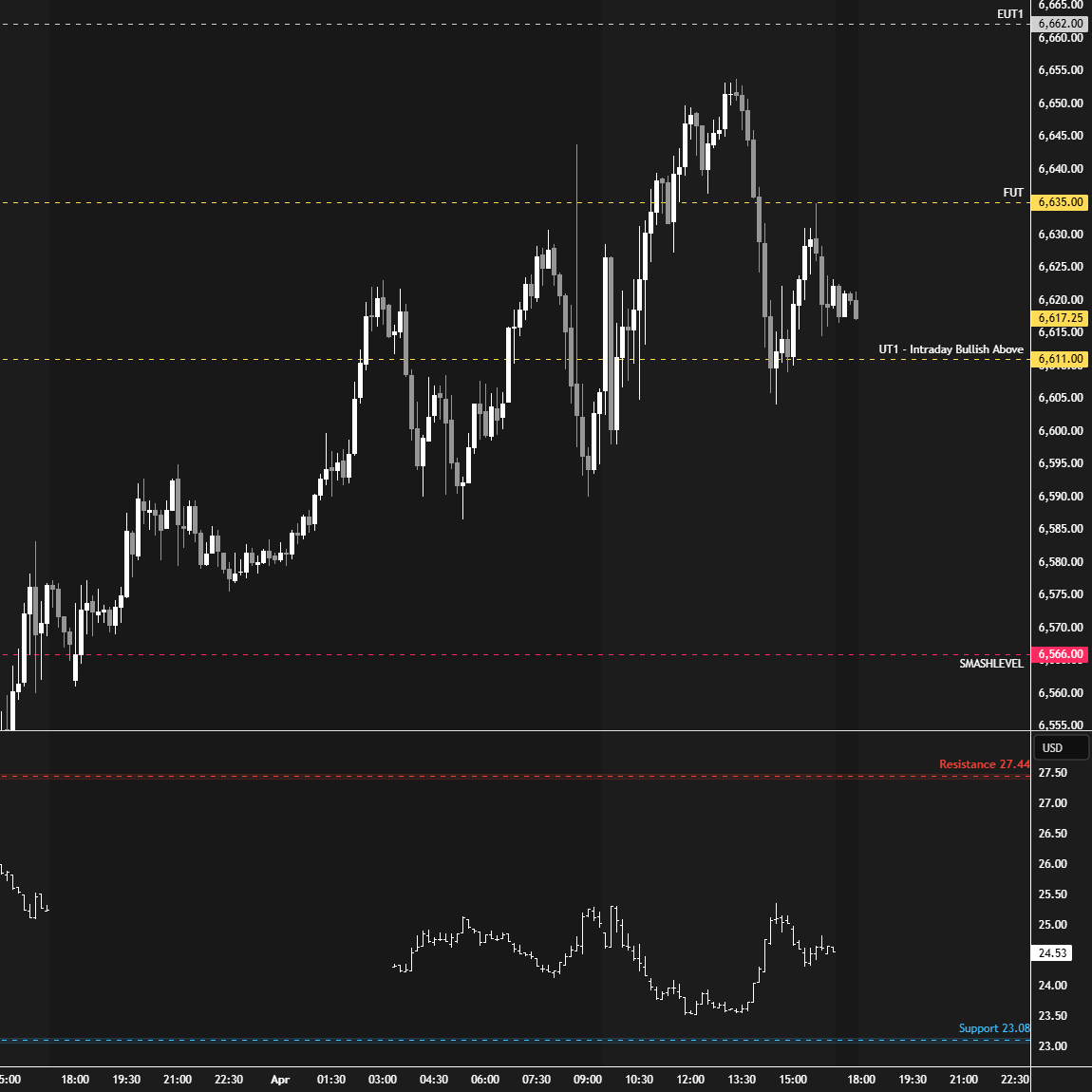 In terms of levels, the Smashlevel is 6606, today’s opening level. Holding above 6606 would target 6635 (UT1). Acceptance above 6635 would signal intraday strength, targeting 6667 (UT2), with a final upside target at 6692 (FUT), the HTF level, under sustained buying pressure.