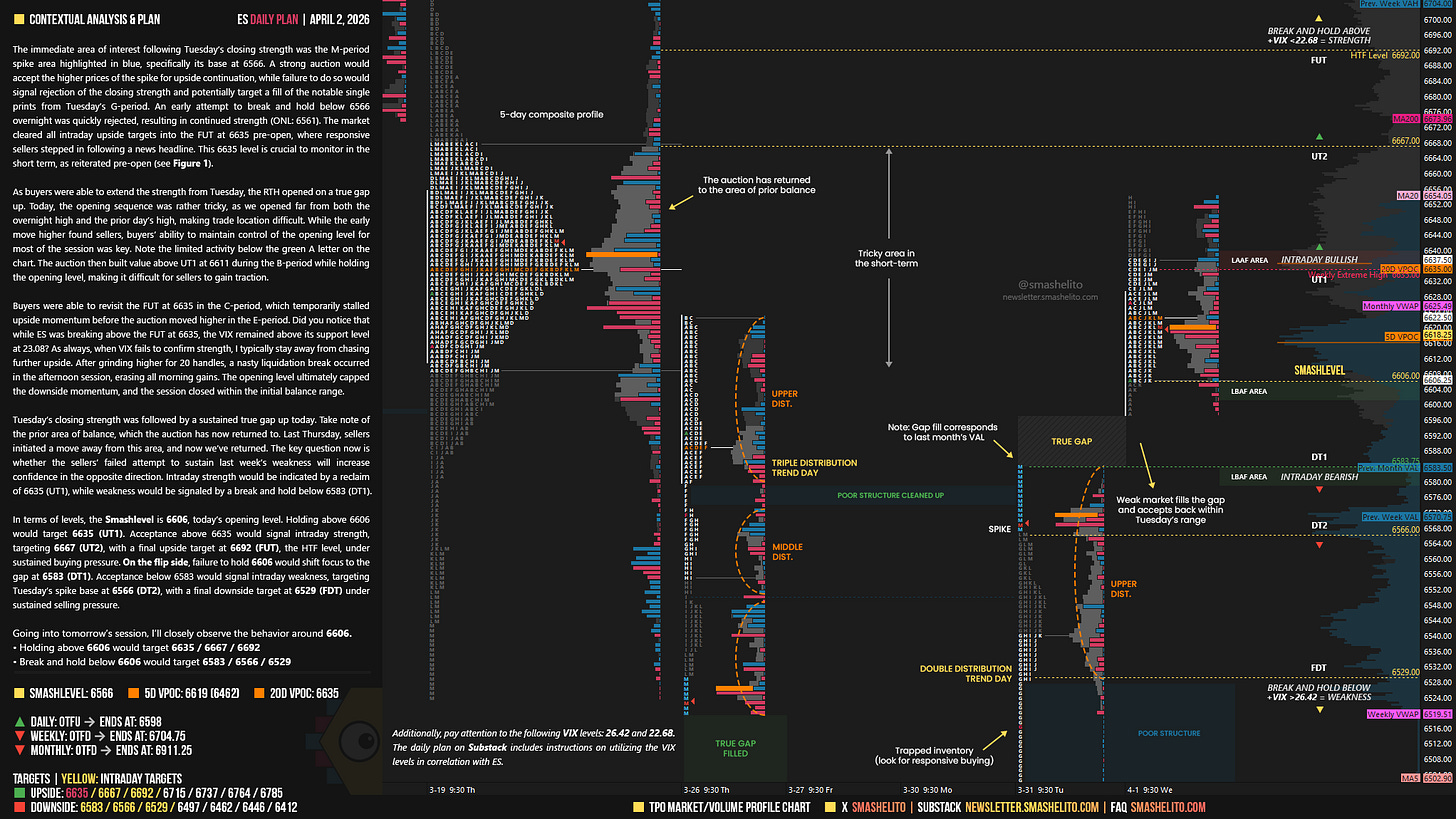 Buyers were able to revisit the FUT at 6635 in the C-period, which temporarily stalled upside momentum before the auction moved higher in the E-period. Did you notice that while ES was breaking above the FUT at 6635, the VIX remained above its support level at 23.08? As always, when VIX fails to confirm strength, I typically stay away from chasing further upside. After grinding higher for 20 handles, a nasty liquidation break occurred in the afternoon session, erasing all morning gains. The opening level ultimately capped the downside momentum, and the session closed within the initial balance range.