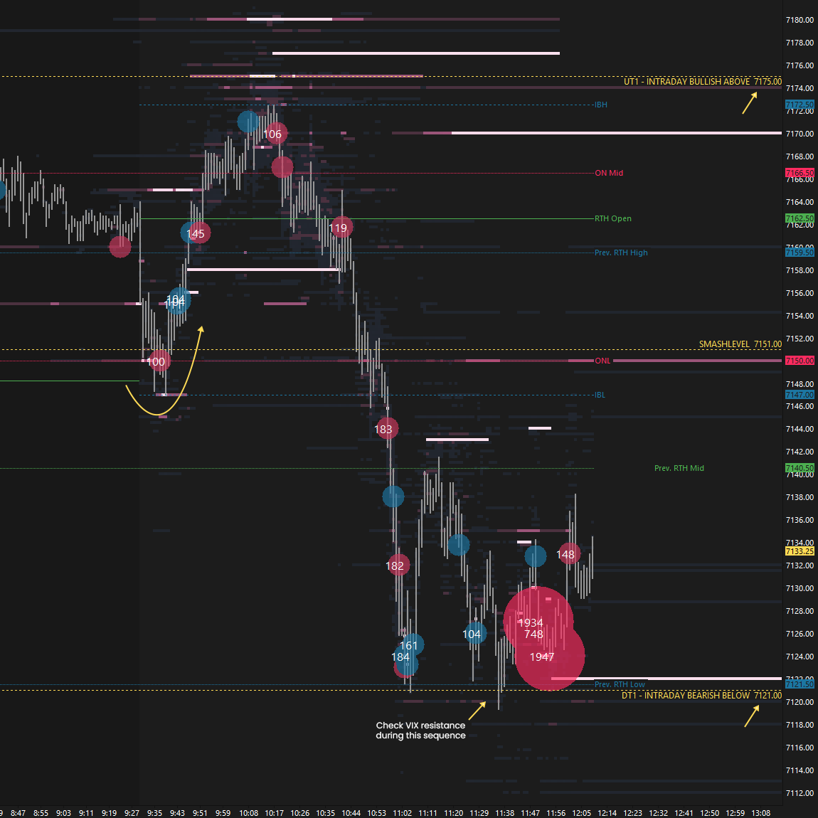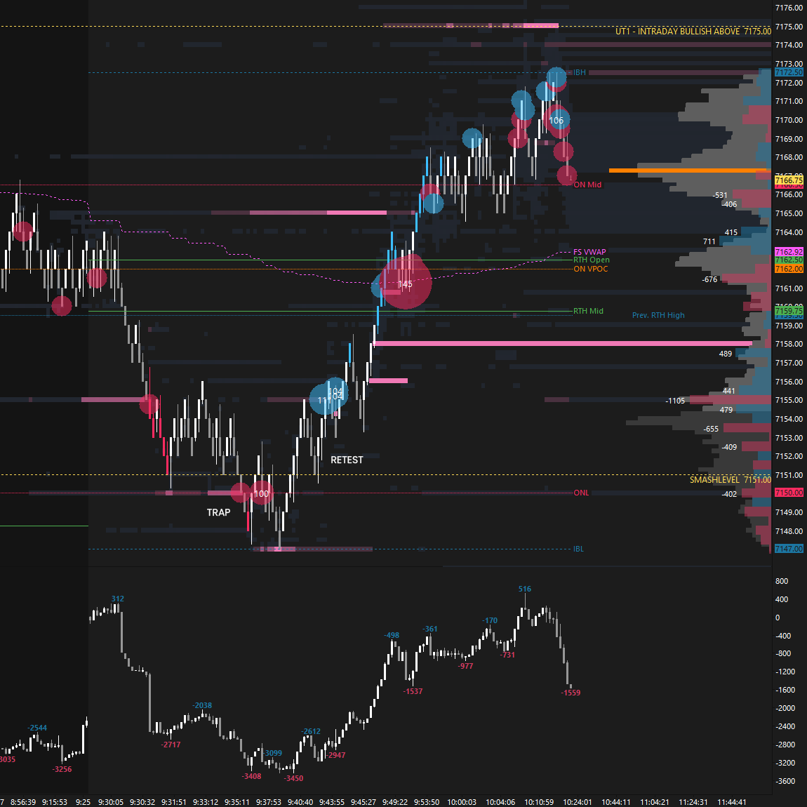 Buyers managed to defend the Smashlevel at 7151 overnight after reclaiming it in yesterday’s after-hours session. Building acceptance above 7151, meaning within Friday’s value, increased the odds of traversing that value area toward UT1 at 7175, which was eventually achieved prior to the RTH open. Responsive sellers were active above 7175 (UT1).