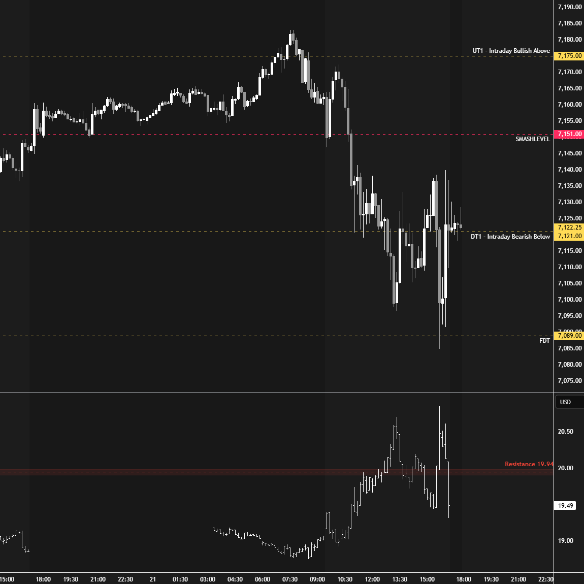 In terms of levels, the Smashlevel is 7117, Friday’s low. Holding below 7117 would target the HTF level at 7092 (DT1). Acceptance below 7092 would signal intraday weakness, targeting 7062 (DT2), with a final downside target at 7043 (FDT) under sustained selling pressure.