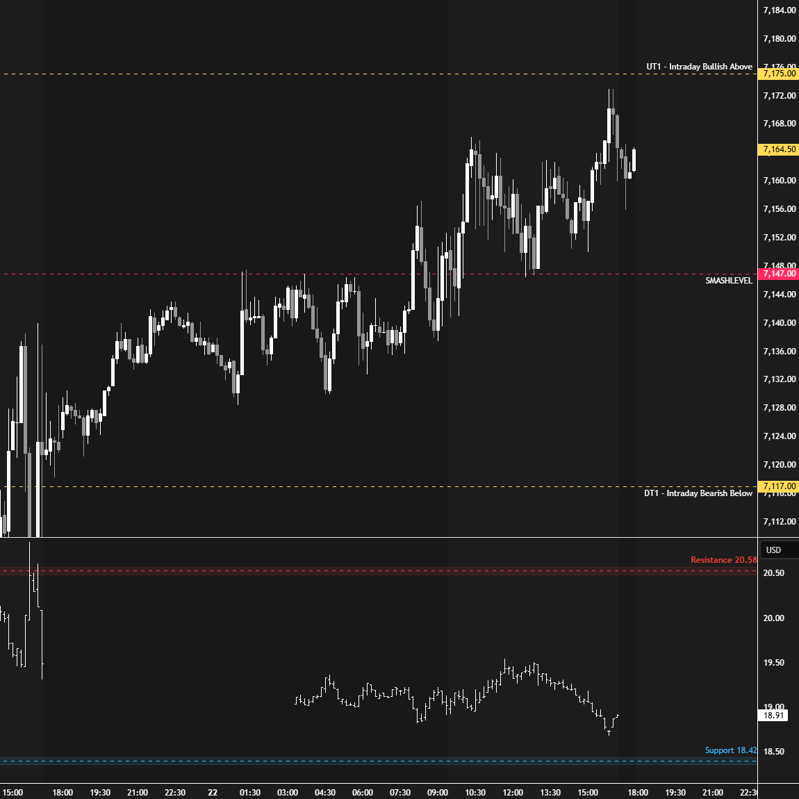In terms of levels, the Smashlevel is 7166, the spike base. Holding above 7166 would target 7191 (UT1). Acceptance above 7191 would signal intraday strength, targeting 7217 (UT2), with a final upside target at 7233 (FUT) under sustained buying pressure.