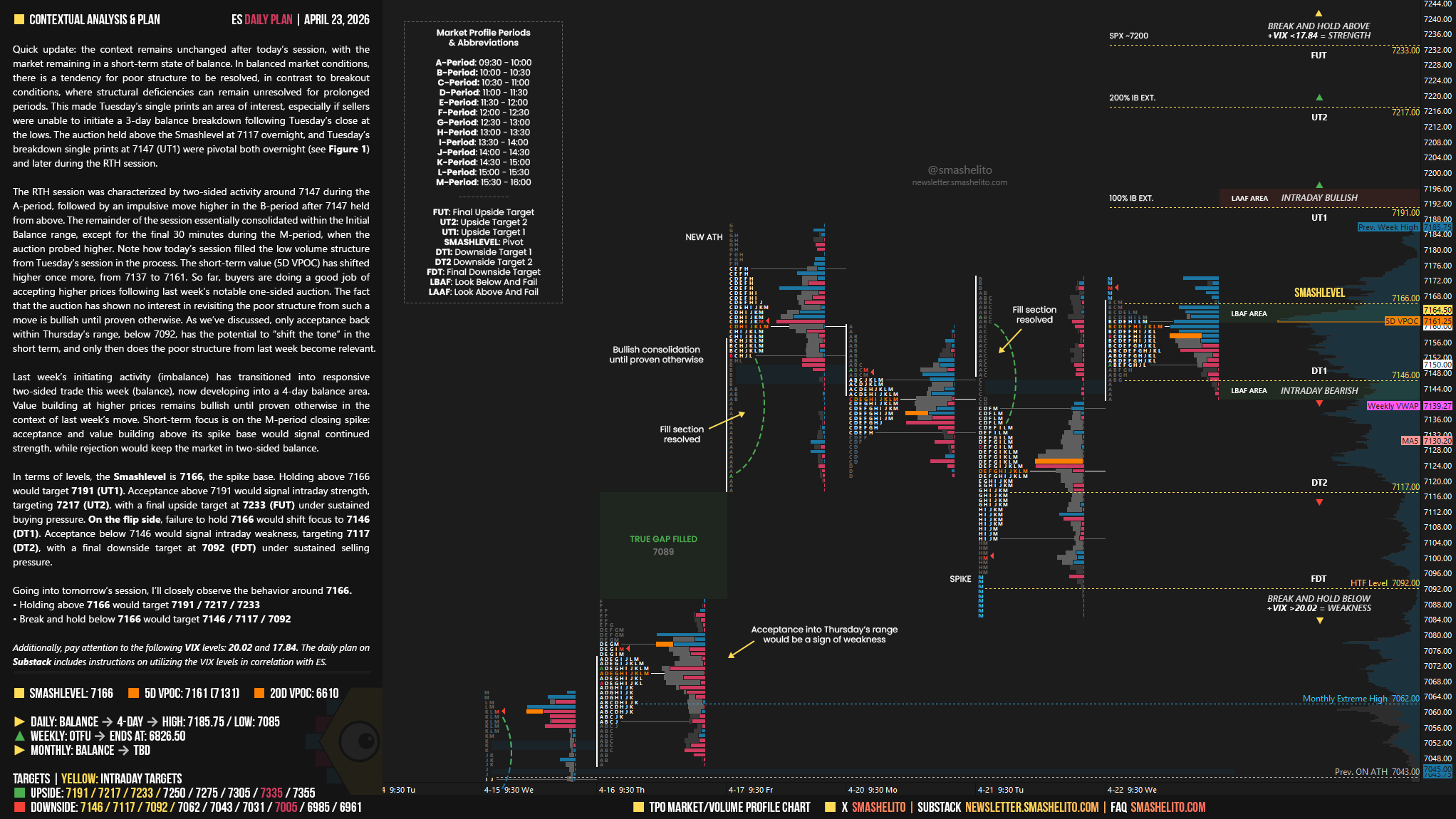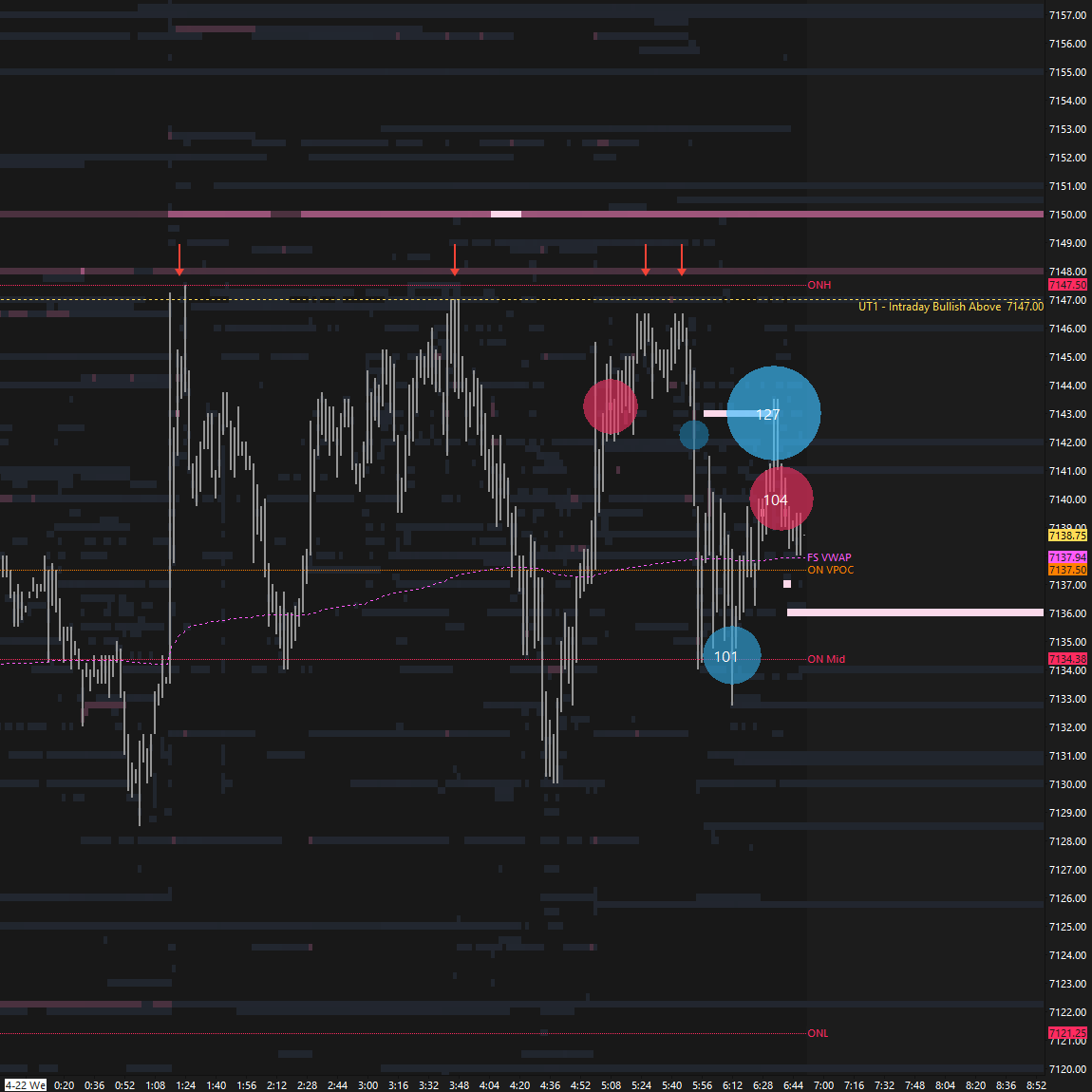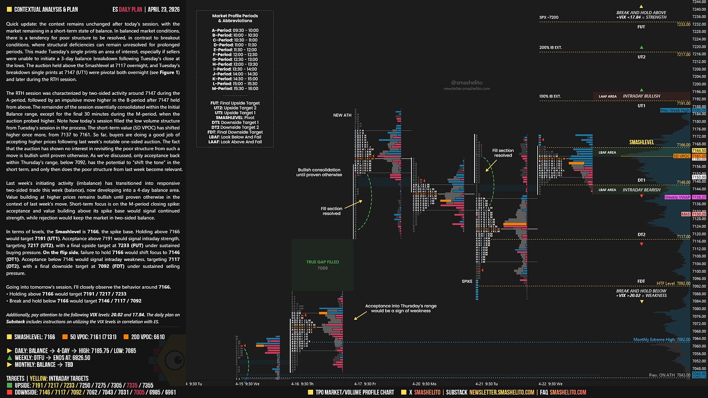 Quick update: the context remains unchanged after today’s session, with the market remaining in a short-term state of balance. In balanced market conditions, there is a tendency for poor structure to be resolved, in contrast to breakout conditions, where structural deficiencies can remain unresolved for prolonged periods. This made Tuesday’s single prints an area of interest, especially if sellers were unable to initiate a 3-day balance breakdown following Tuesday’s close at the lows. The auction held above the Smashlevel at 7117 overnight, and Tuesday’s breakdown single prints at 7147 (UT1) were pivotal both overnight (see Figure 1) and later during the RTH session.