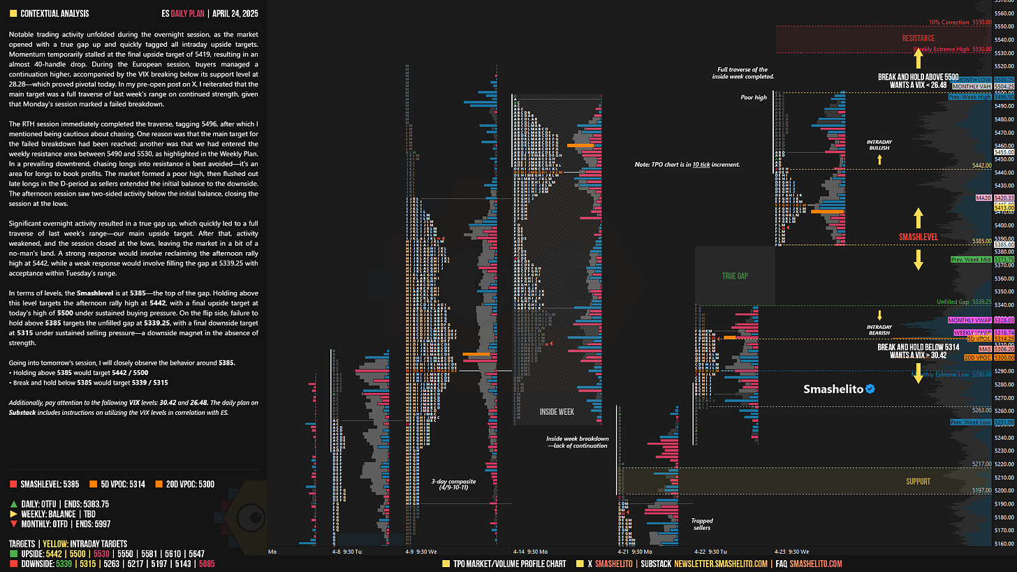 Notable trading activity unfolded during the overnight session, as the market opened with a true gap up and quickly tagged all intraday upside targets. Momentum temporarily stalled at the final upside target of 5419, resulting in an almost 40-handle drop. During the European session, buyers managed a continuation higher, accompanied by the VIX breaking below its support level at 28.28—which proved pivotal today. In my pre-open post on X, I reiterated that the main target was a full traverse of last week’s range on continued strength, given that Monday's session marked a failed breakdown.
