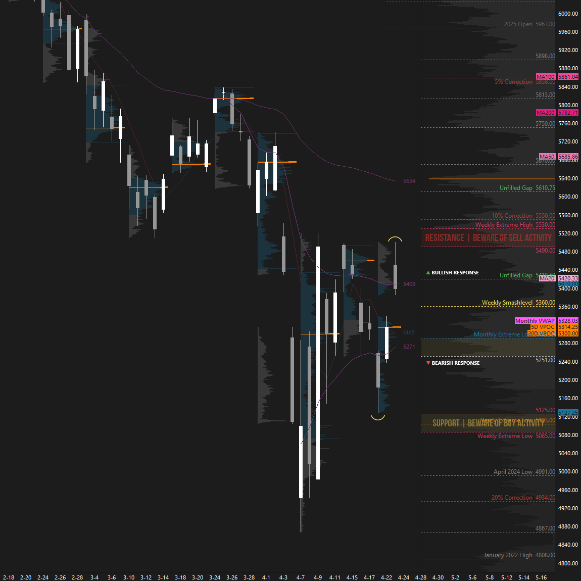 In terms of levels, the Smashlevel is at 5385—the top of the gap. Holding above this level targets the afternoon rally high at 5442, with a final upside target at today’s high of 5500 under sustained buying pressure. On the flip side, failure to hold above 5385 targets the unfilled gap at 5339.25, with a final downside target at 5315 under sustained selling pressure—a downside magnet in the absence of strength.