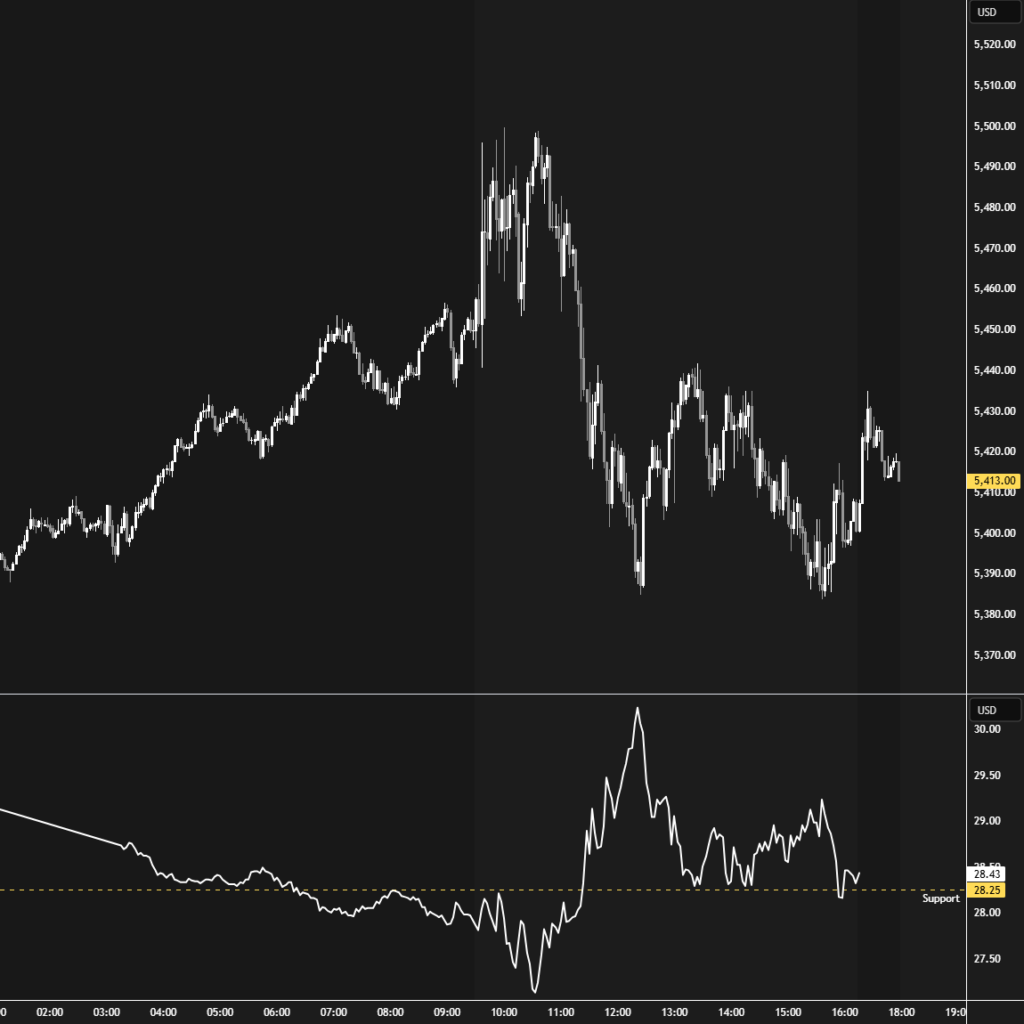 Break and hold below 5315 with VIX above 30.42 would confirm weakness.