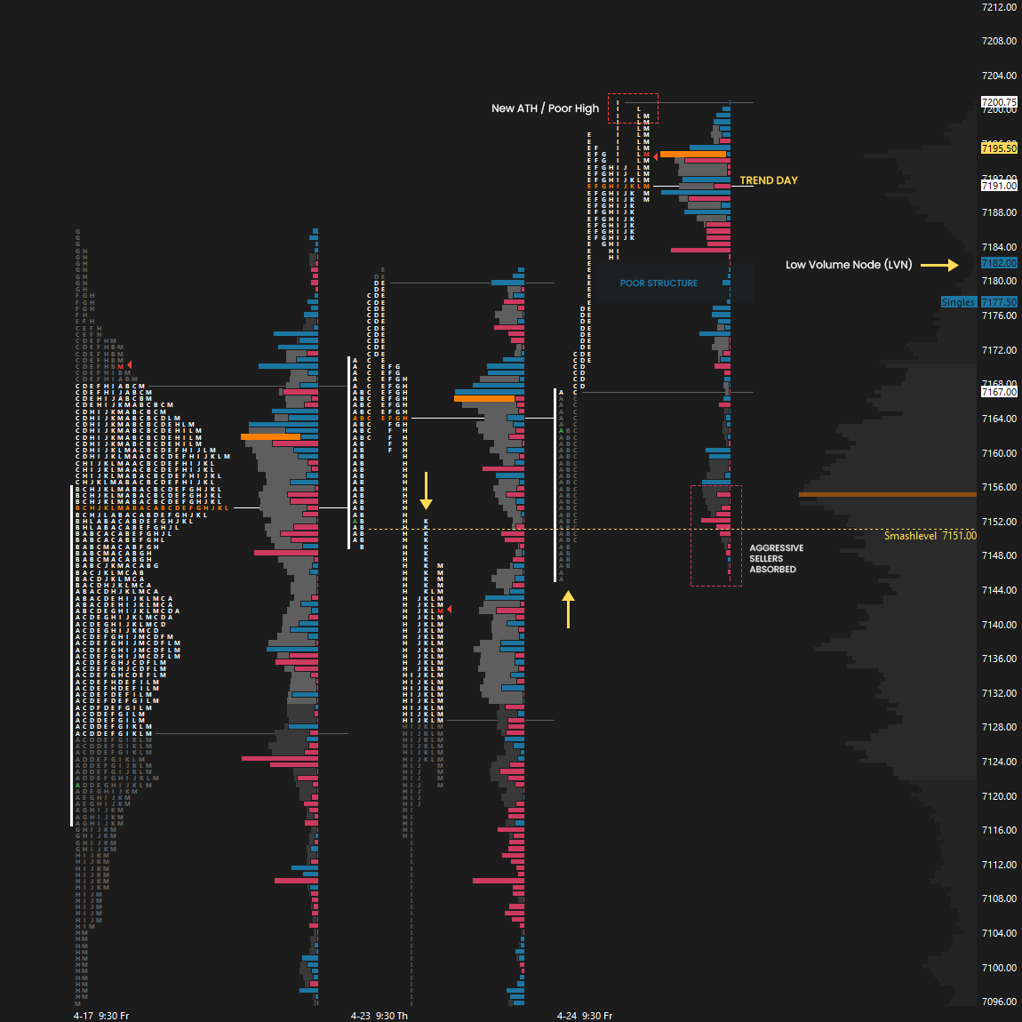 The Smashlevel for Friday’s session was 7151, and notably, aggressive sellers were absorbed by passive buyers in that area. The failure of sellers to gain acceptance below 7151 ultimately served as fuel for an upside continuation that resulted in a breakout from the 5-day balance area (see Figure 1). A new ATH printed at 7200.50, which we carry forward as a poor high given the lack of excess.
