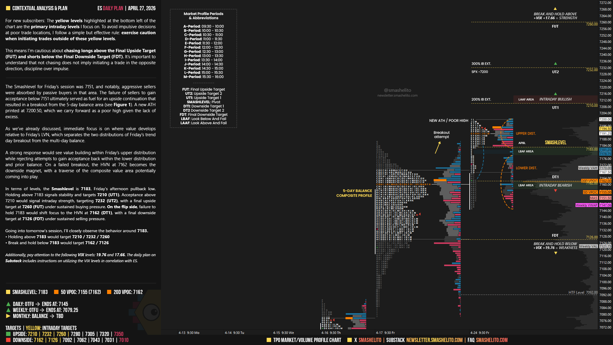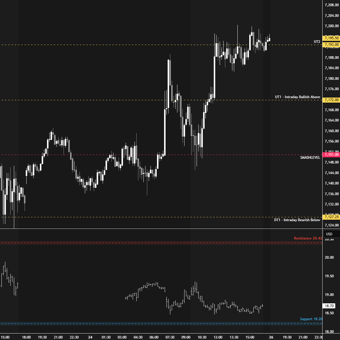 In terms of levels, the Smashlevel is 7183, Friday’s afternoon pullback low. Holding above 7183 signals stability and targets 7210 (UT1). Acceptance above 7210 would signal intraday strength, targeting 7232 (UT2), with a final upside target at 7260 (FUT) under sustained buying pressure.