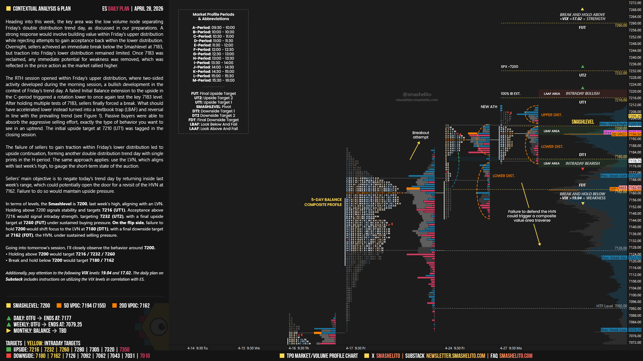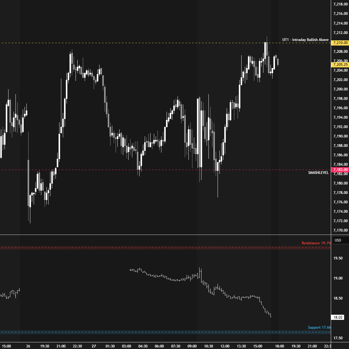 In terms of levels, the Smashlevel is 7200, last week’s high, aligning with an LVN. Holding above 7200 signals stability and targets 7216 (UT1). Acceptance above 7216 would signal intraday strength, targeting 7232 (UT2), with a final upside target at 7260 (FUT) under sustained buying pressure.