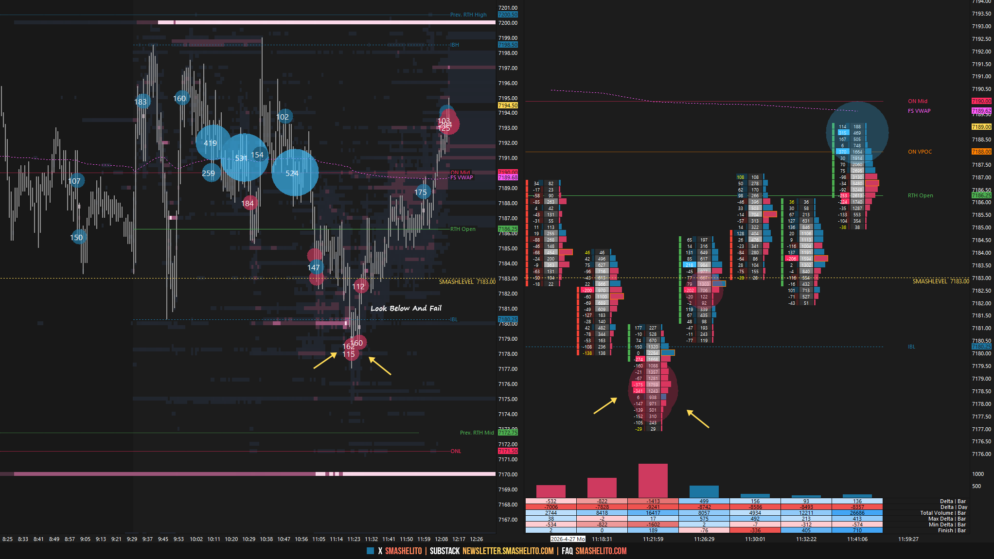 Heading into this week, the key area was the low volume node separating Friday’s double distribution trend day, as discussed in our preparations. A strong response would involve building value within Friday’s upper distribution while rejecting attempts to gain acceptance back within the lower distribution. Overnight, sellers achieved an immediate break below the Smashlevel at 7183, but traction into Friday’s lower distribution remained limited. Once 7183 was reclaimed, any immediate potential for weakness was removed, which was reflected in the price action as the market rallied higher.