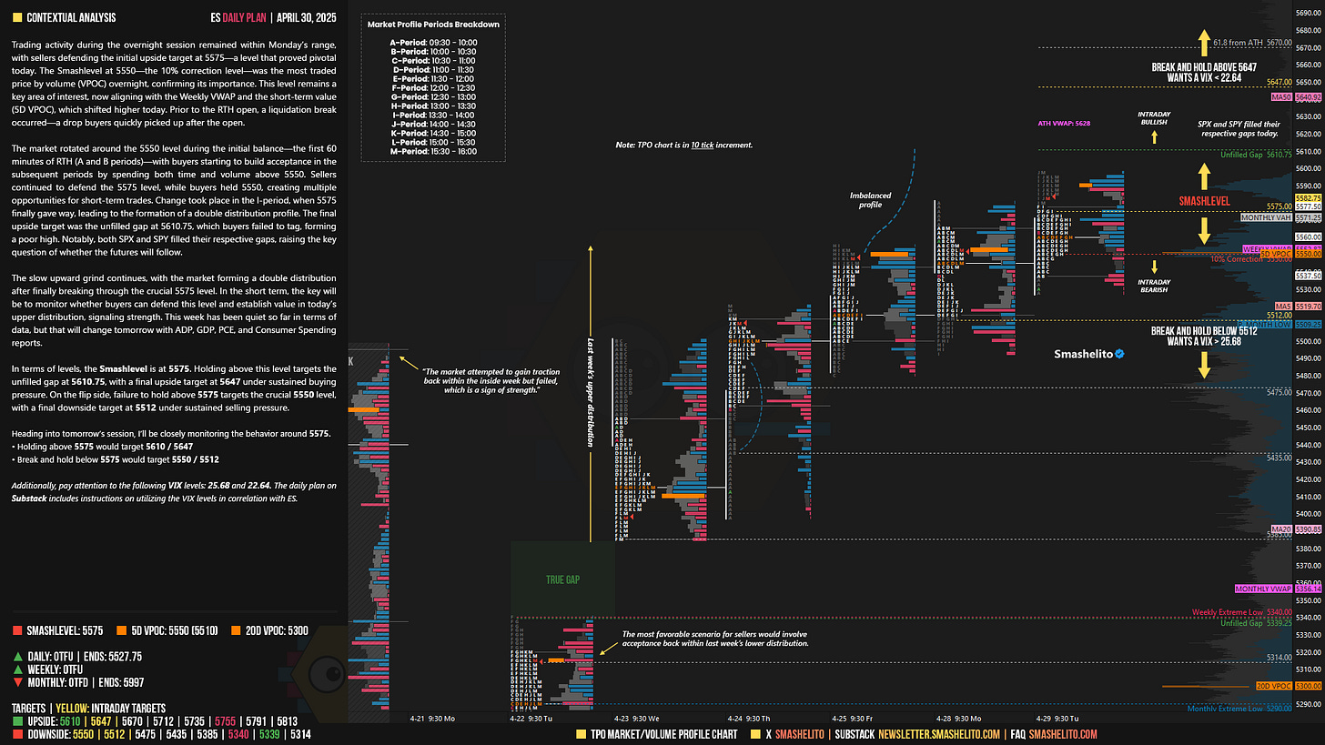 The market rotated around the 5550 level during the initial balance—the first 60 minutes of RTH (A and B periods)—with buyers starting to build acceptance in the subsequent periods by spending both time and volume above 5550. Sellers continued to defend the 5575 level, while buyers held 5550, creating multiple opportunities for short-term trades. Change took place in the I-period, when 5575 finally gave way, leading to the formation of a double distribution profile. The final upside target was the unfilled gap at 5610.75, which buyers failed to tag, forming a poor high. Notably, both SPX and SPY filled their respective gaps, raising the key question of whether the futures will follow.