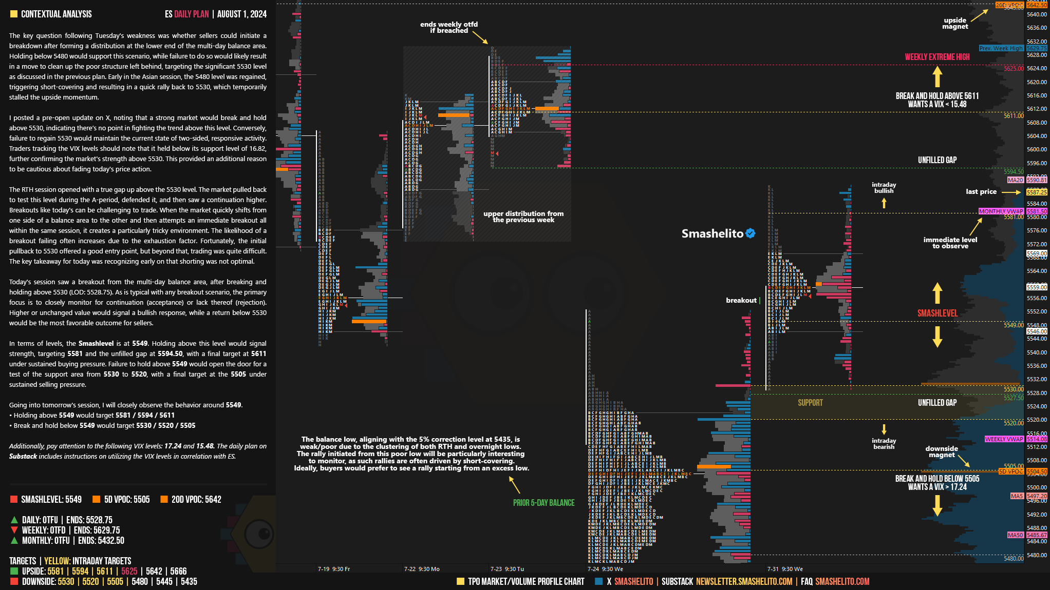 In terms of levels, the Smashlevel is at 5549. Holding above this level would signal strength, targeting 5581 and the unfilled gap at 5594.50, with a final target at 5611 under sustained buying pressure. Failure to hold above 5549 would open the door for a test of the support area from 5530 to 5520, with a final target at the 5505 under sustained selling pressure.