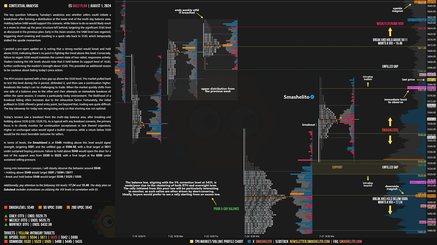 Today's session saw a breakout from the multi-day balance area, after breaking and holding above 5530 (LOD: 5528.75). As is typical with any breakout scenario, the primary focus is to closely monitor for continuation (acceptance) or lack thereof (rejection). Higher or unchanged value would signal a bullish response, while a return below 5530 would be the most favorable outcome for sellers.