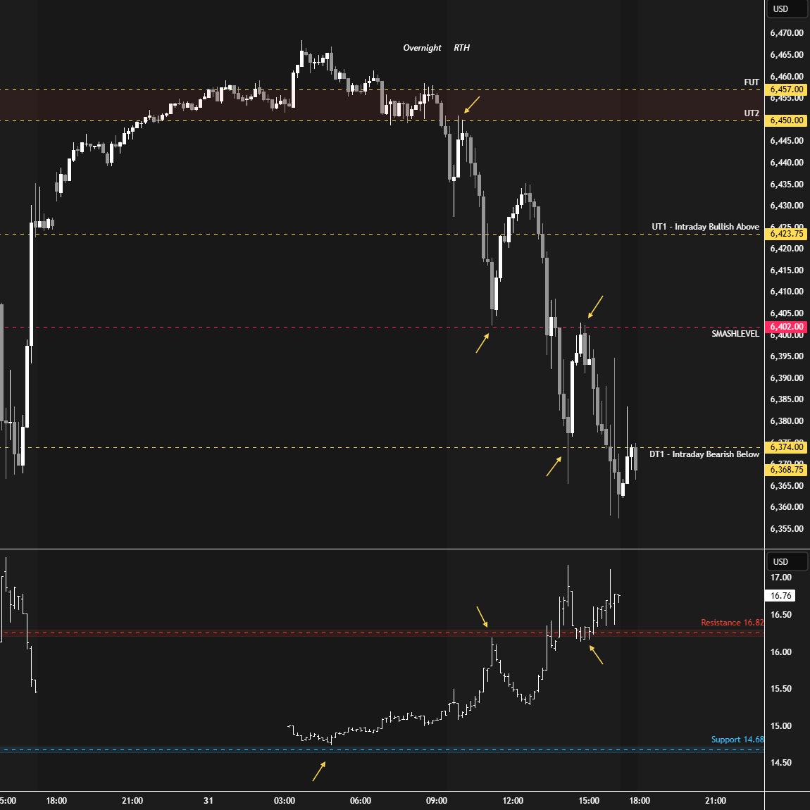 The RTH session opened on a true gap up and saw an immediate inventory correction, which wasn’t a huge surprise given the open just below the resistance area between 6450 and 6457, as well as the significant overnight move. An inventory correction isn’t inherently bearish unless acceptance is established back within the prior day’s range. It’s important not to mistake the early weakness for stronger sellers. The gap was filled during the A-period, where buyers were waiting for a gap-fill reversal, targeting a retest the the 6450-57 area. Sellers managed to defend this resistance area, not allowing buyers to gain traction above the opening level. This ultimately led to a second test of Wednesday’s high in the C-period, which failed to hold. The Smashlevel for today was set at 6402—which was a crucial level for buyers to defend. The D-period came within one tick of testing 6402, where buyers stepped in (see Figure 1), in confluence with the VIX approaching its resistance level at 16.26 (see Figure 2).
