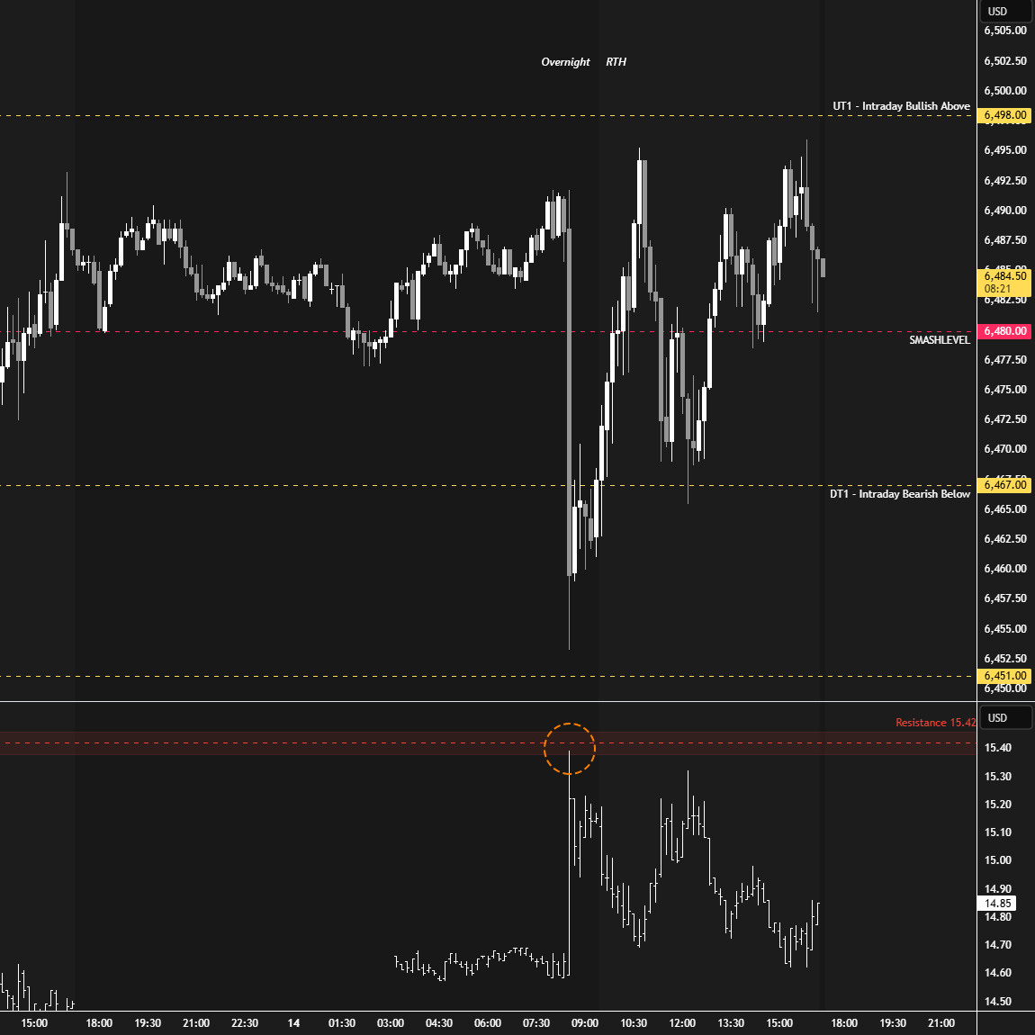 The overnight session was a non-event leading up to the PPI data release, with buyers successfully defending the Smashlevel at 6480. Following the release, the market dropped 35 handles but found responsive buyers just 2 handles above the highlighted support area between 6451 and 6443 (ONL: 6453.25). Did you notice how the VIX came just shy of testing its resistance level at 15.42 during this sequence? HOD: 15.39. Sellers had three objectives today: keep Wednesday’s excess high intact, end the daily one-time framing up, and gain acceptance back within Tuesday’s value area. The first two were achieved; however, traction within Tuesday’s value area was limited.