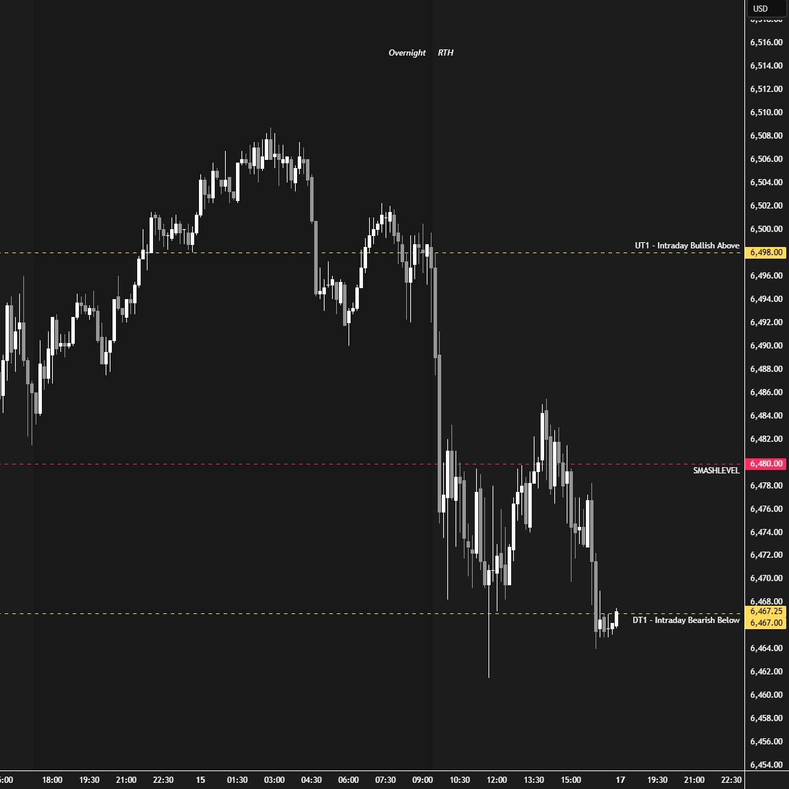 In terms of levels, the Smashlevel is at 6467—the lower end of the current 3-day balance area. Holding above 6467 would signal strength, targeting 6483 (UT1). Acceptance above 6483 would target the upper end of the 3-day balance area at 6498 (UT2), with a final upside target (FUT) at 6520 under sustained buying pressure.
