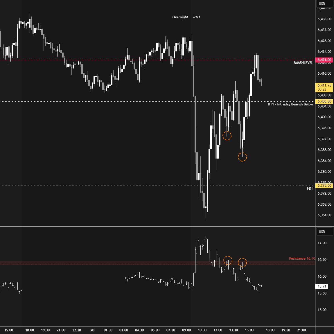 Sellers ultimately failed to hold below the FDT at 6375, which would have been the most bearish outcome today with VIX elevated. This failure triggered short-covering, with the market retracing the entire drop. The better and safer buying opportunities emerged in the afternoon session, when VIX dropped back below its resistance at 16.40 (see Figure 1). Buyers initially struggled to reclaim DT1 at 6406, but after the liquidation break in the J-period, a successful reclaim of 6406 led to a test of the Smashlevel at 6421 into the close, where sellers were waiting.