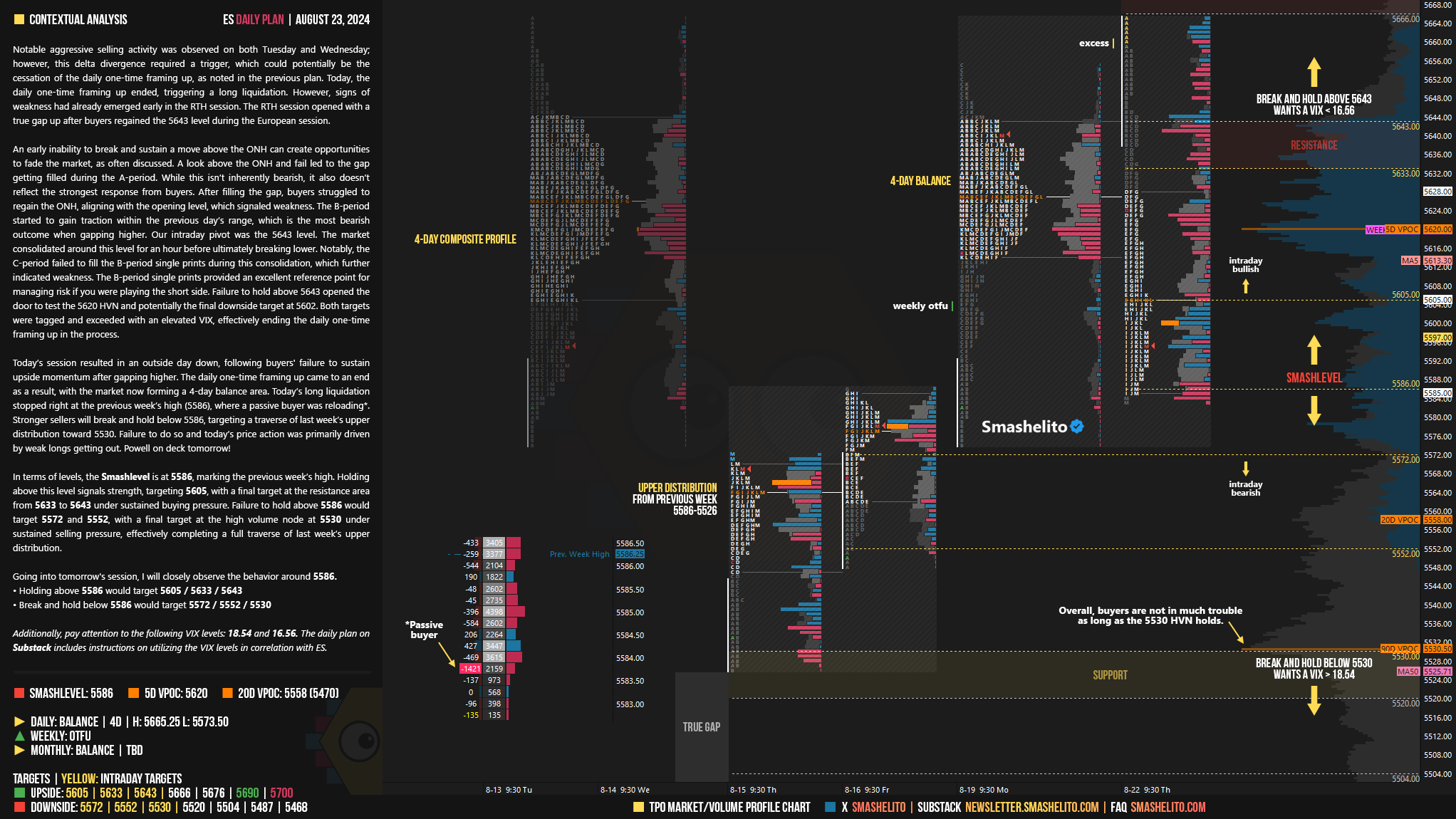 In terms of levels, the Smashlevel is at 5586, marking the previous week’s high. Holding above this level signals strength, targeting 5605, with a final target at the resistance area from 5633 to 5643 under sustained buying pressure. Failure to hold above 5586 would target 5572 and 5552, with a final target at the high volume node at 5530 under sustained selling pressure, effectively completing a full traverse of last week’s upper distribution.