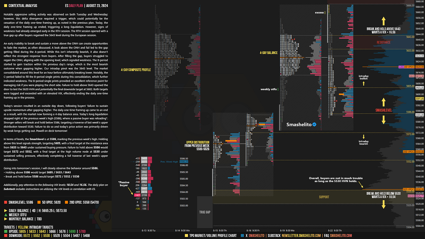 Notable aggressive selling activity was observed on both Tuesday and Wednesday; however, this delta divergence required a trigger, which could potentially be the cessation of the daily one-time framing up, as noted in the previous plan. Today, the daily one-time framing up ended, triggering a long liquidation. However, signs of weakness had already emerged early in the RTH session. The RTH session opened with a true gap up after buyers regained the 5643 level during the European session.