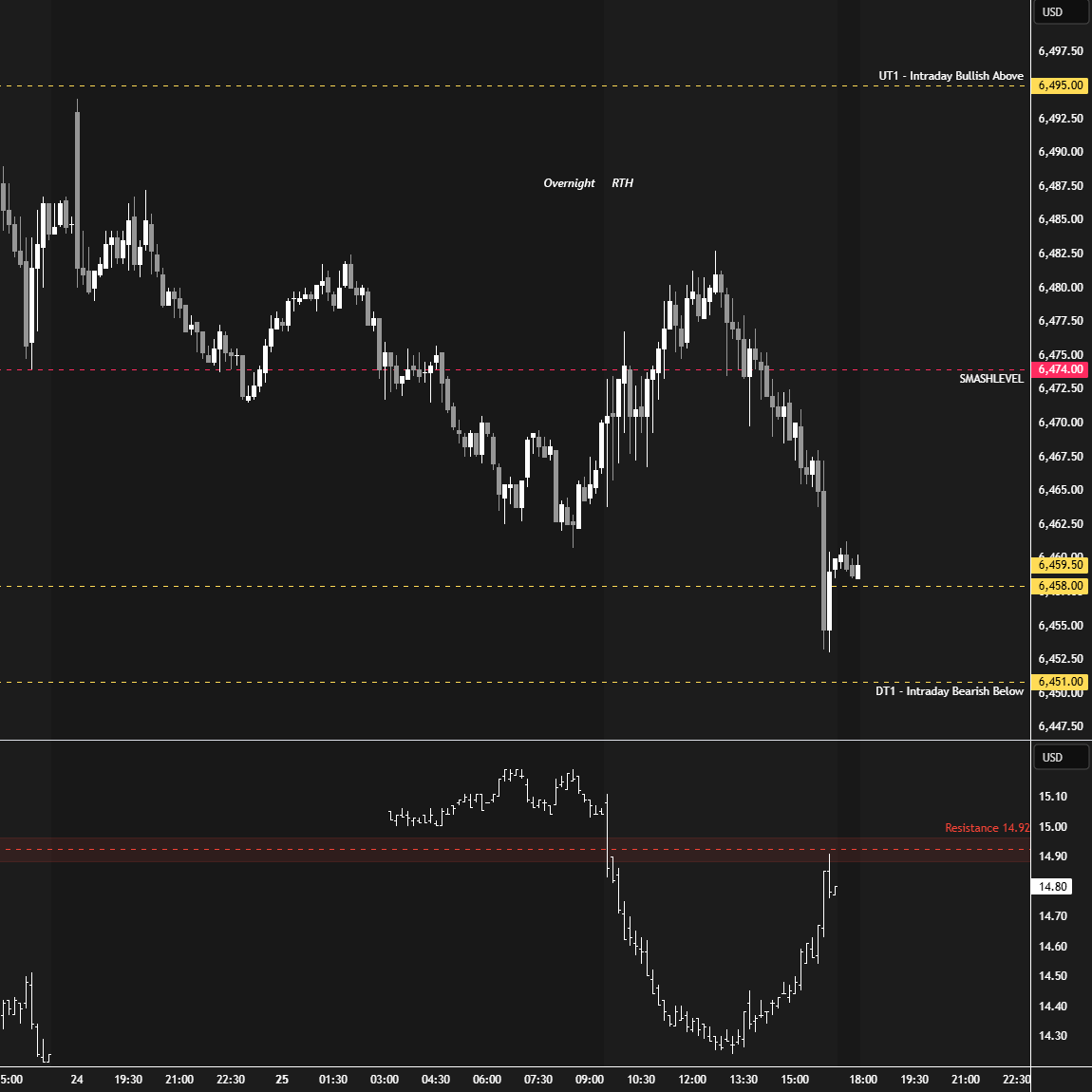 Break and hold above 6508 with VIX below 14.04 would confirm strength.
