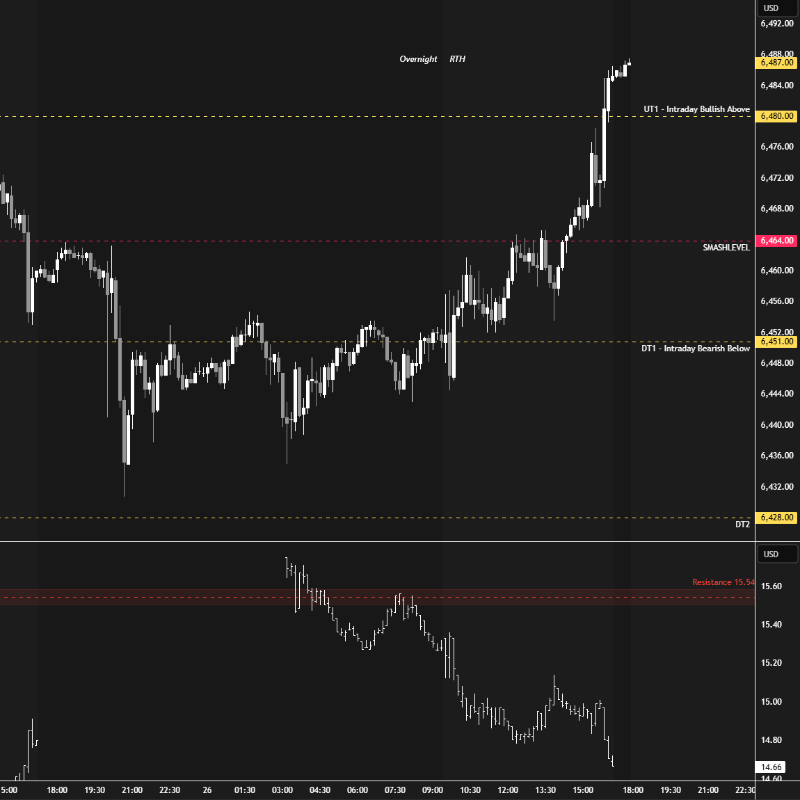 In terms of levels, the Smashlevel is at 6477—the M-period spike base. Holding above 6477 would target 6495 (UT1). Acceptance above 6495 would signal strength, targeting 6508 (UT2), with a final upside target (FUT) at 6525 under sustained buying pressure.