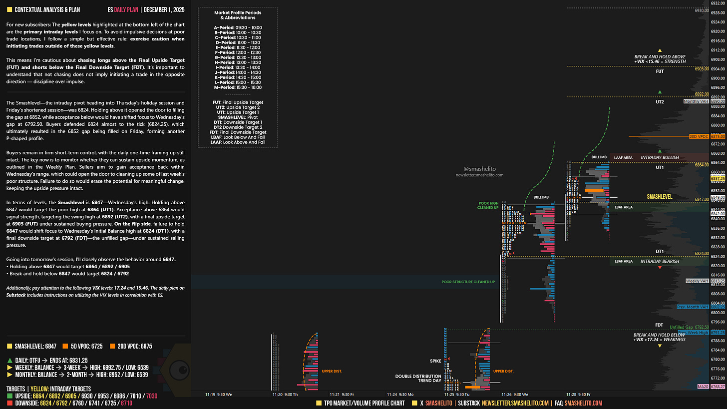 The Smashlevel—the intraday pivot heading into Thursday’s holiday session and Friday’s shortened session—was 6824. Holding above it opened the door to filling the gap at 6852, while acceptance below would have shifted focus to Wednesday’s gap at 6792.50. Buyers defended 6824 almost to the tick (6824.25), which ultimately resulted in the 6852 gap being filled on Friday, forming another P-shaped profile.