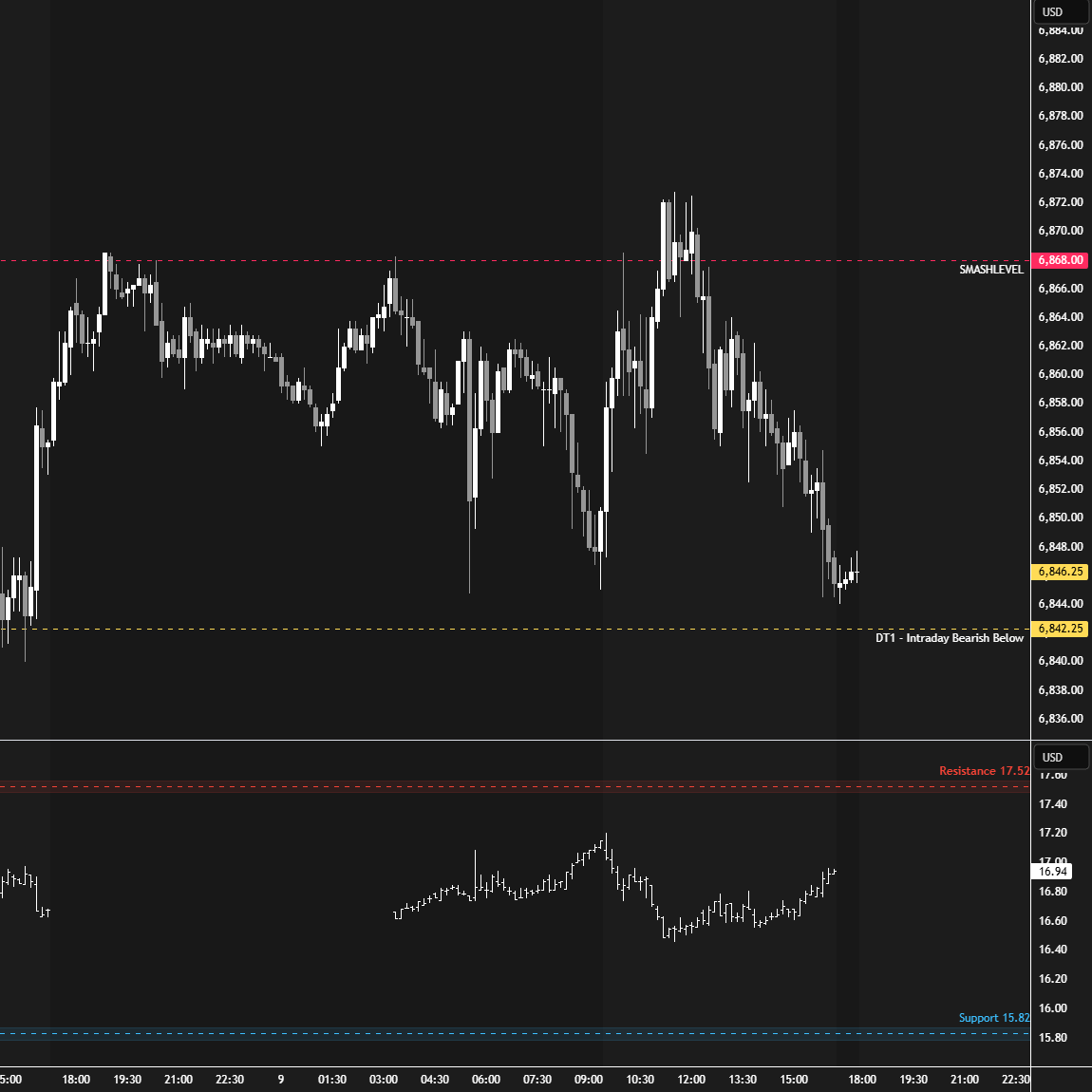In terms of levels, the Smashlevel is 6842—Monday’s VAL. Holding above 6842 would target last week’s value area high (VAH) at 6868 (UT1). Acceptance above 6868 would signal strength, targeting 6891 (UT2), with a final upside target at 6909 (FUT) under sustained buying pressure.