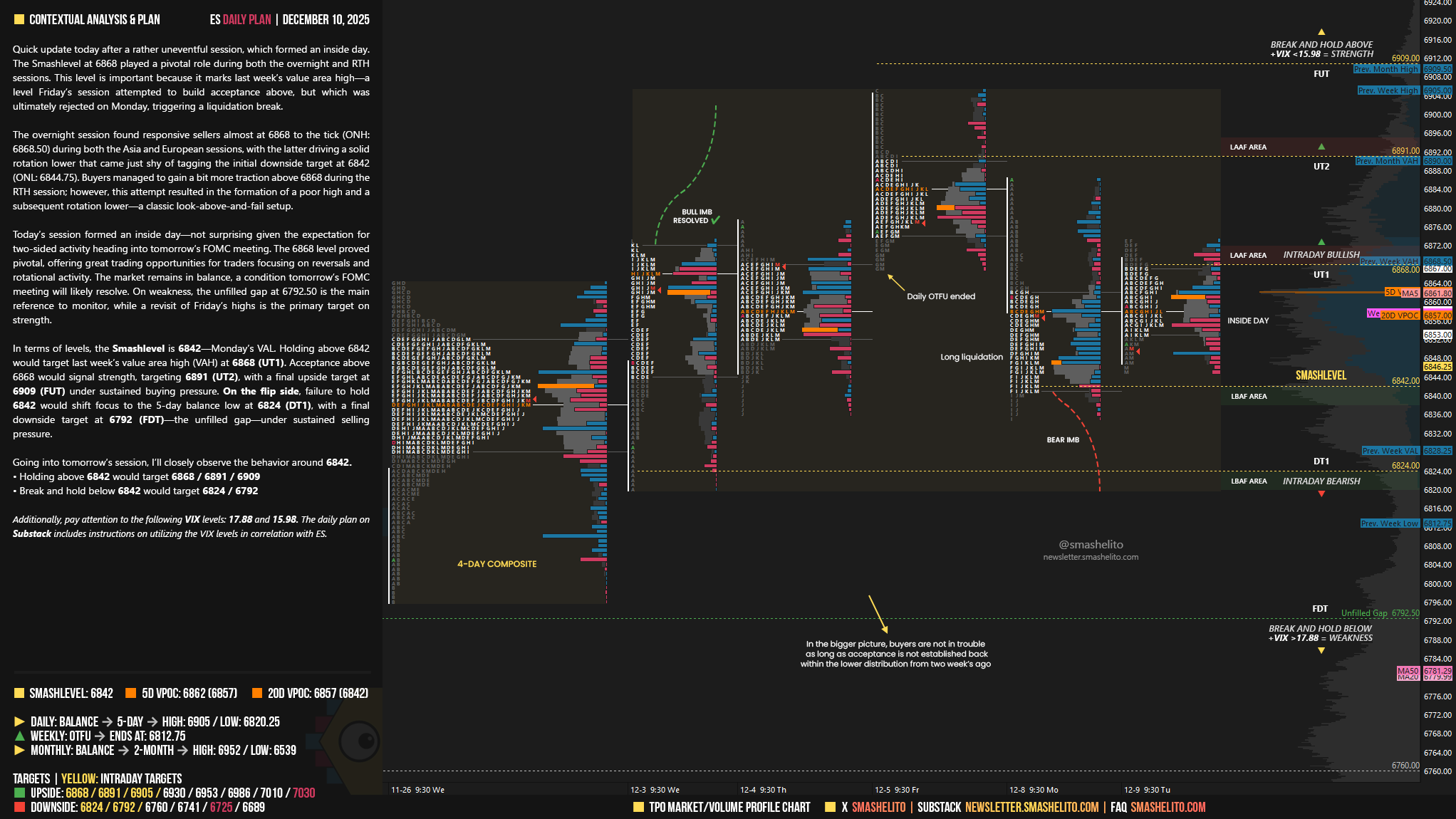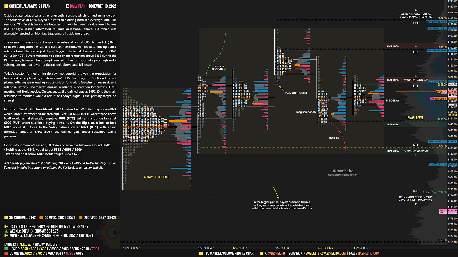 Quick update today after a rather uneventful session, which formed an inside day. The Smashlevel at 6868 played a pivotal role during both the overnight and RTH sessions. This level is important because it marks last week’s value area high—a level Friday’s session attempted to build acceptance above, but which was ultimately rejected on Monday, triggering a liquidation break.