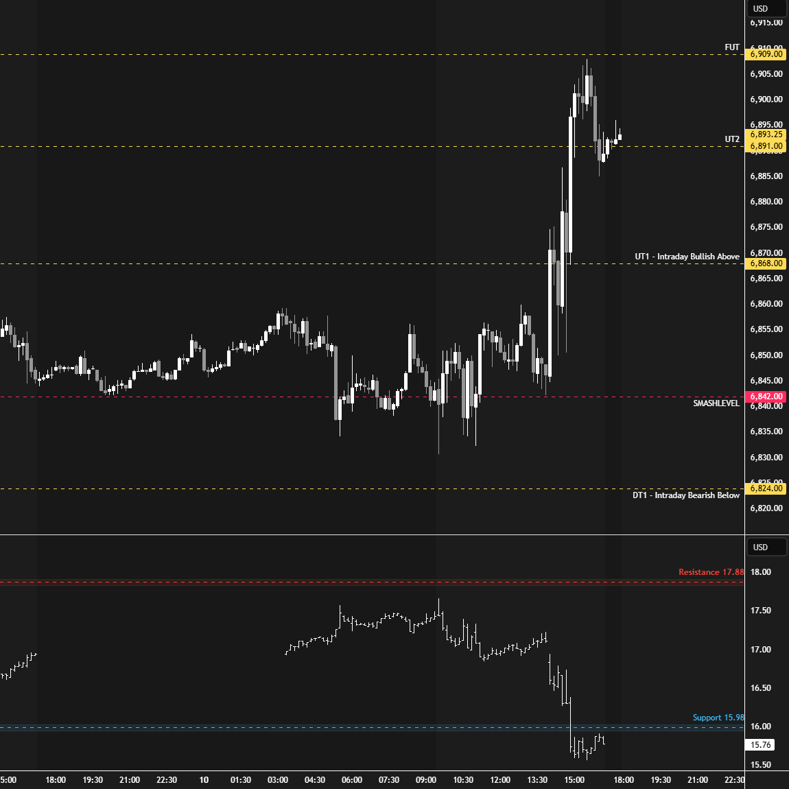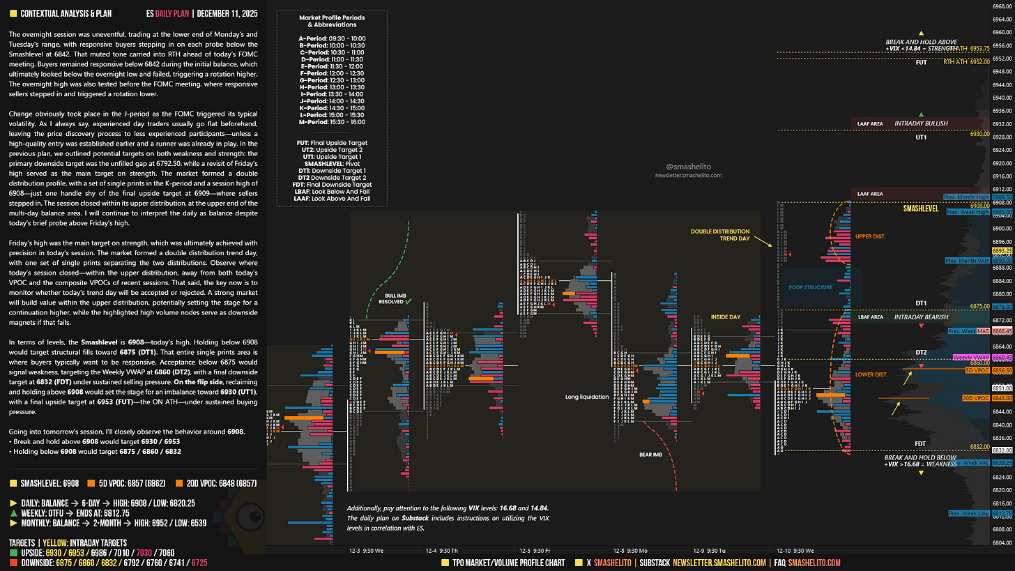 In terms of levels, the Smashlevel is 6908—today’s high. Holding below 6908 would target structural fills toward 6875 (DT1). That entire single prints area is where buyers typically want to be responsive. Acceptance below 6875 would signal weakness, targeting the Weekly VWAP at 6860 (DT2), with a final downside target at 6832 (FDT) under sustained selling pressure.