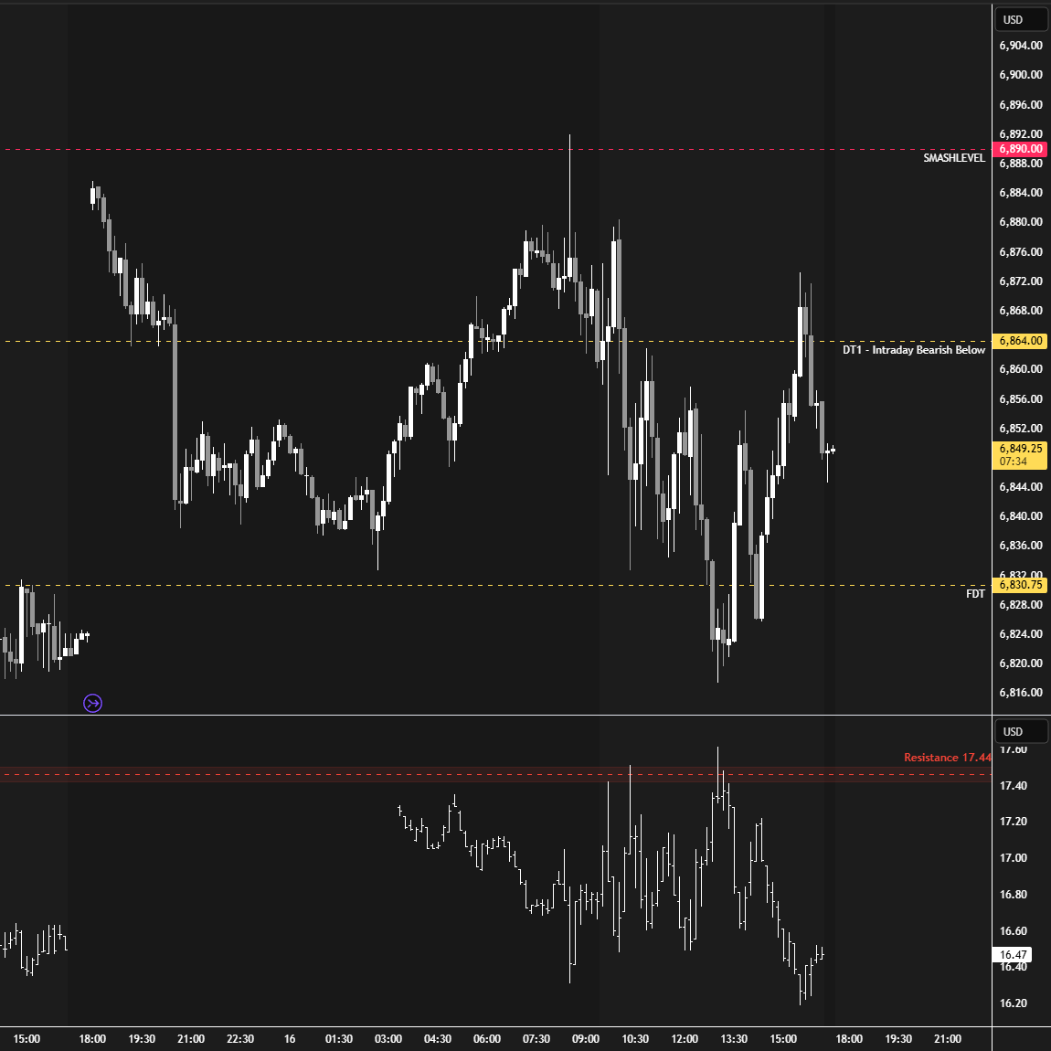 In terms of levels, the Smashlevel is 6862—the opening level, which coincides with Monday’s low, today’s VAH, and the weekly VWAP. Holding below 6862 would target the HVN at 6842 (DT1). Acceptance below 6842 would signal weakness, targeting 6822 (DT2), with a final downside target at 6792 (FDT)—the unfilled gap—under sustained selling pressure.