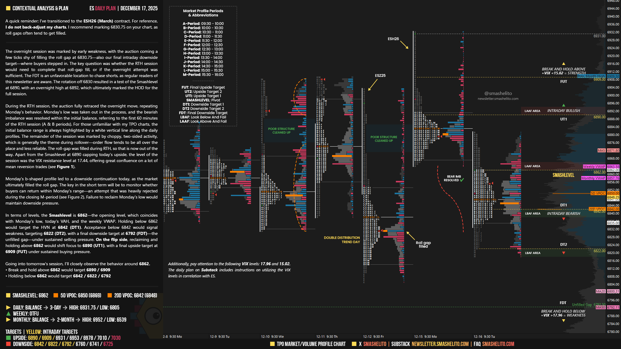 During the RTH session, the auction fully retraced the overnight move, repeating Monday’s behavior. Monday’s low was taken out in the process, and the bearish imbalance was resolved within the initial balance, referring to the first 60 minutes of the RTH session (A & B periods). For those unfamiliar with my TPO charts, the initial balance range is always highlighted by a white vertical line along the daily profiles. The remainder of the session was marked by choppy, two-sided activity, which is generally the theme during rollover—order flow tends to be all over the place and less reliable. The roll-gap was filled during RTH, so that is now out of the way. Apart from the Smashlevel at 6890 capping today’s upside, the level of the session was the VIX resistance level at 17.44, offering great confluence on a lot of mean reversion trades (see Figure 1).