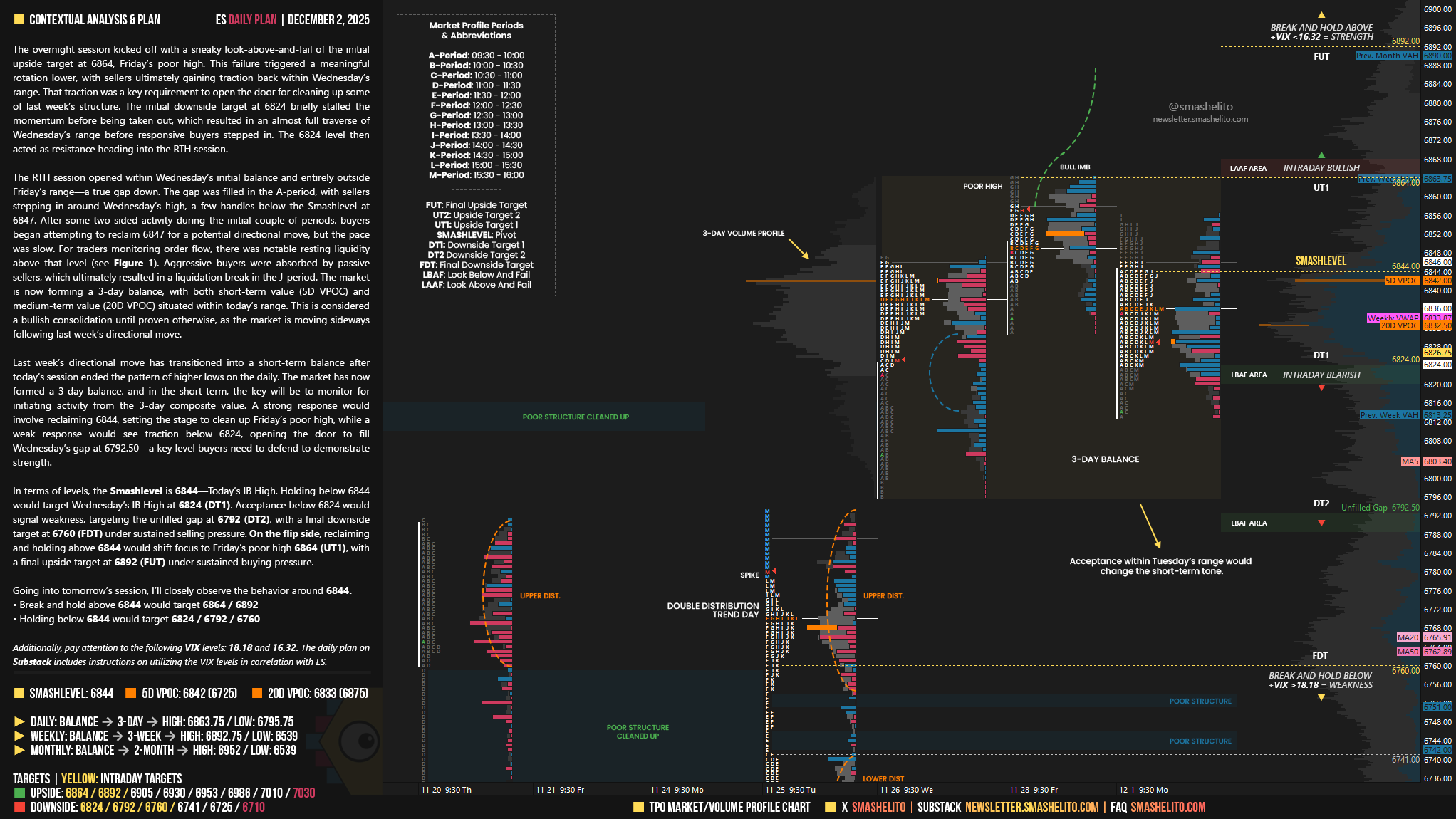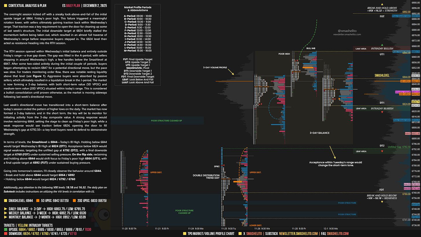The RTH session opened within Wednesday’s initial balance and entirely outside Friday’s range—a true gap down. The gap was filled in the A-period, with sellers stepping in around Wednesday’s high, a few handles below the Smashlevel at 6847. After some two-sided activity during the initial couple of periods, buyers began attempting to reclaim 6847 for a potential directional move, but the pace was slow. For traders monitoring order flow, there was notable resting liquidity above that level (see Figure 1). Aggressive buyers were absorbed by passive sellers, which ultimately resulted in a liquidation break in the J-period. The market is now forming a 3-day balance, with both short-term value (5D VPOC) and medium-term value (20D VPOC) situated within today’s range. This is considered a bullish consolidation until proven otherwise, as the market is moving sideways following last week’s directional move.