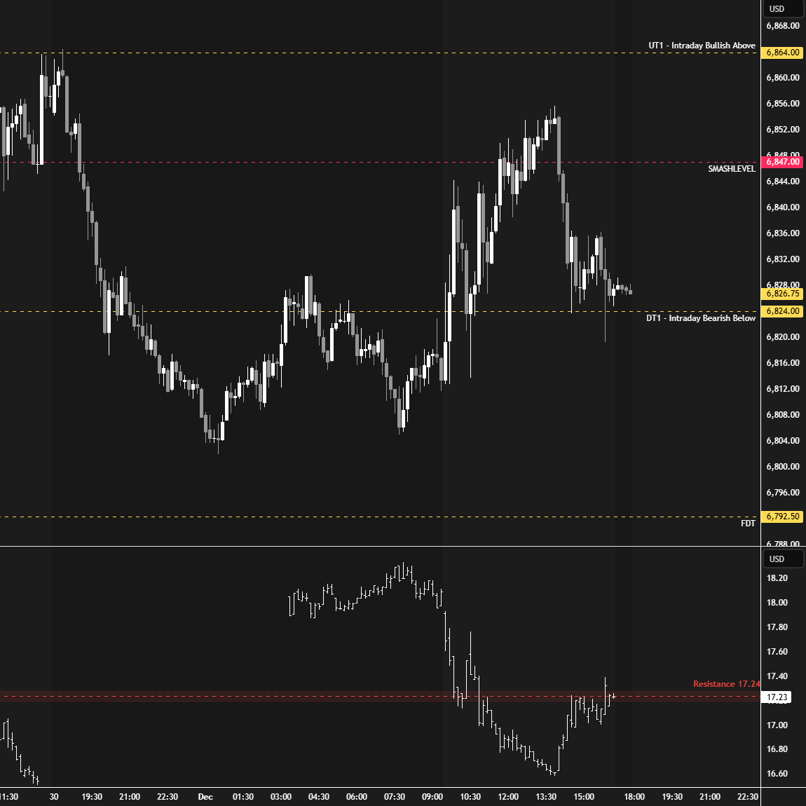 In terms of levels, the Smashlevel is 6844—Today’s IB High. Holding below 6844 would target Wednesday’s IB High at 6824 (DT1). Acceptance below 6824 would signal weakness, targeting the unfilled gap at 6792 (DT2), with a final downside target at 6760 (FDT) under sustained selling pressure.